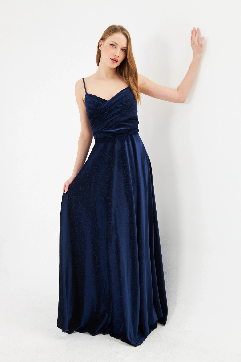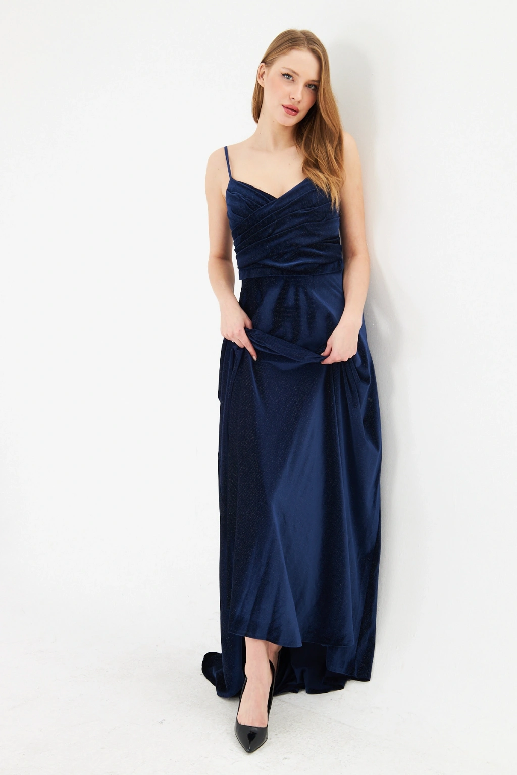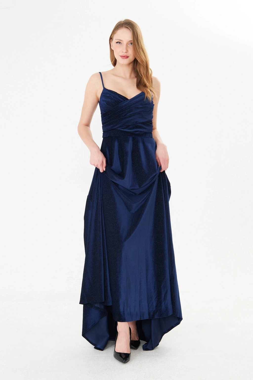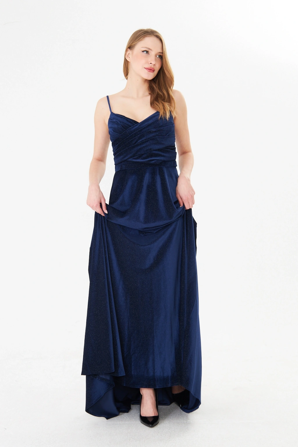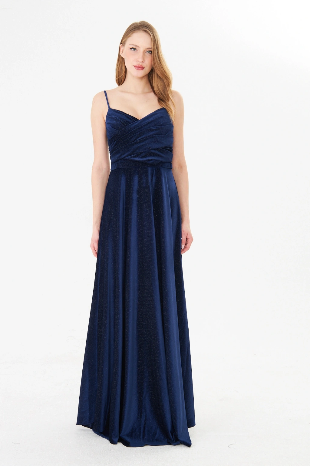 Askılı Drapeli Uzun Abiye Elbise – Şık Gece Davet Düğün Elbisesi