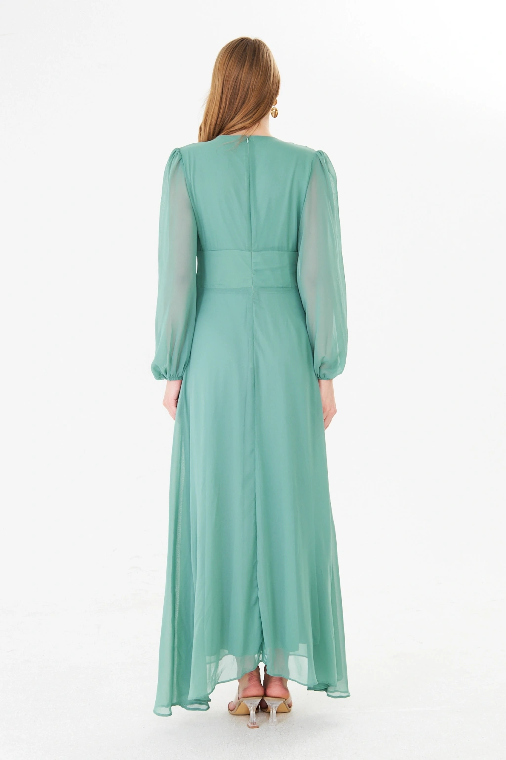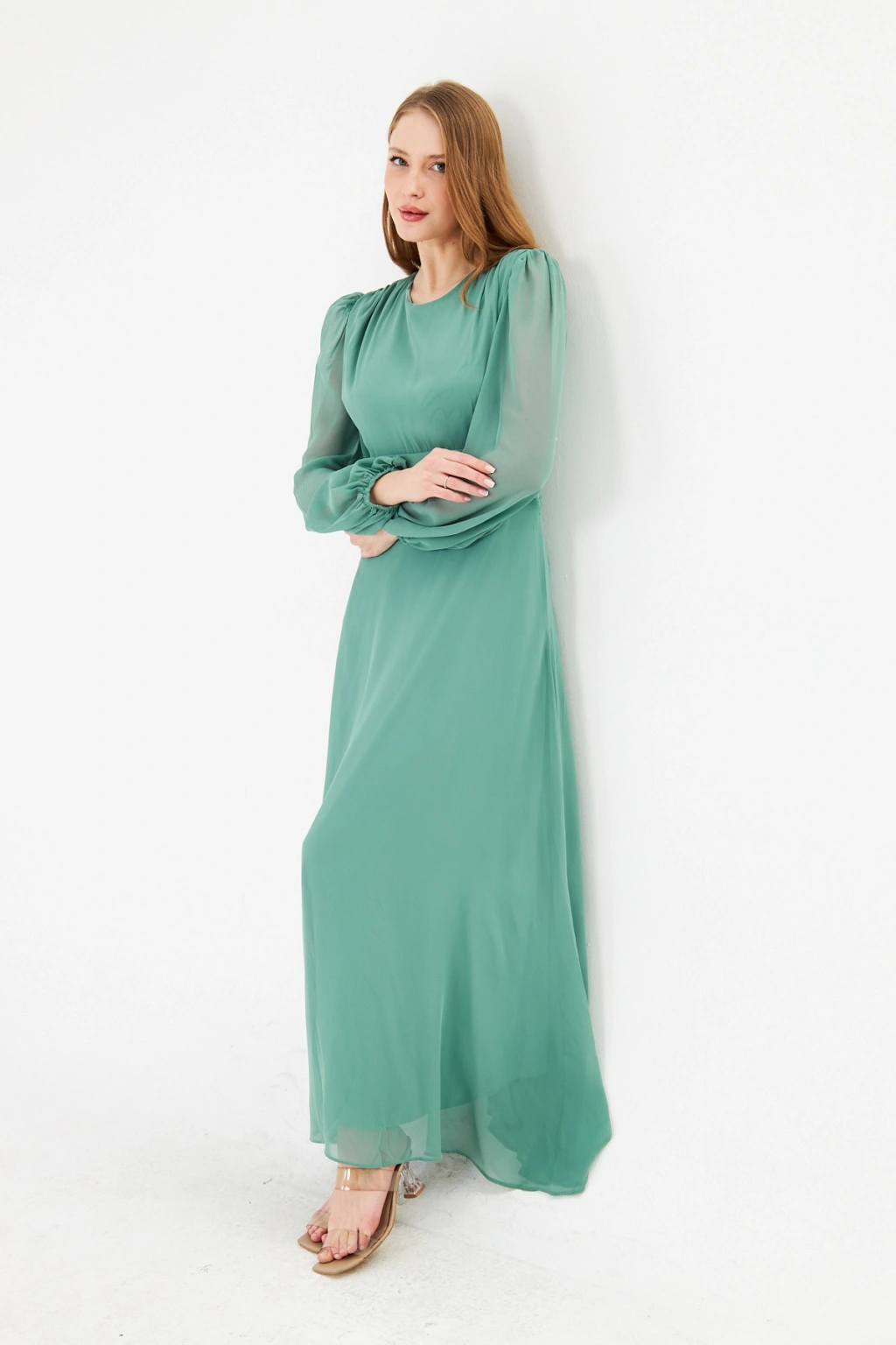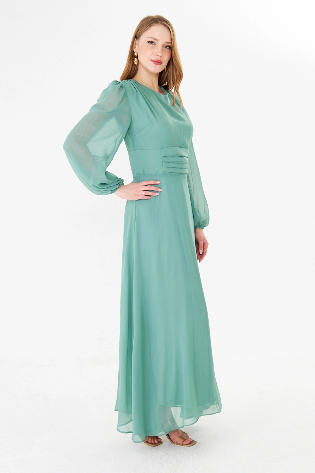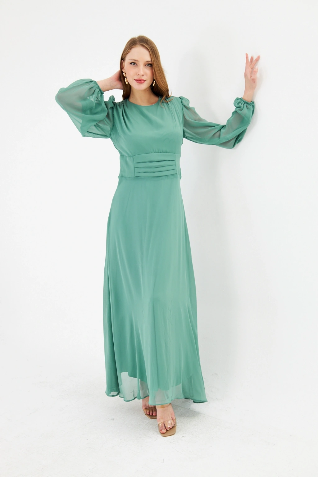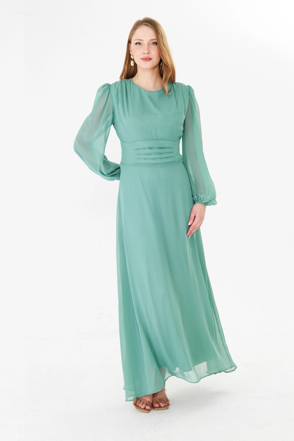 Balon Kollu Pileli Şifon Maxi Elbise – Astarlı Zarif Tasarım