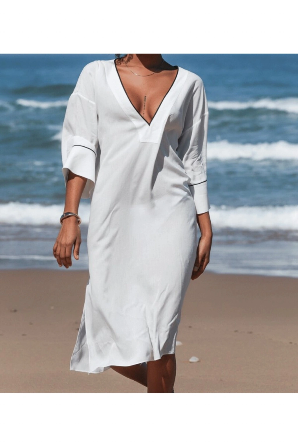 - Yaz aylarının vazgeçilmezi olan bu beyaz elbise, hafif dokusuyla serin tutar ve rahat hareket etme özgürlüğü sunar.