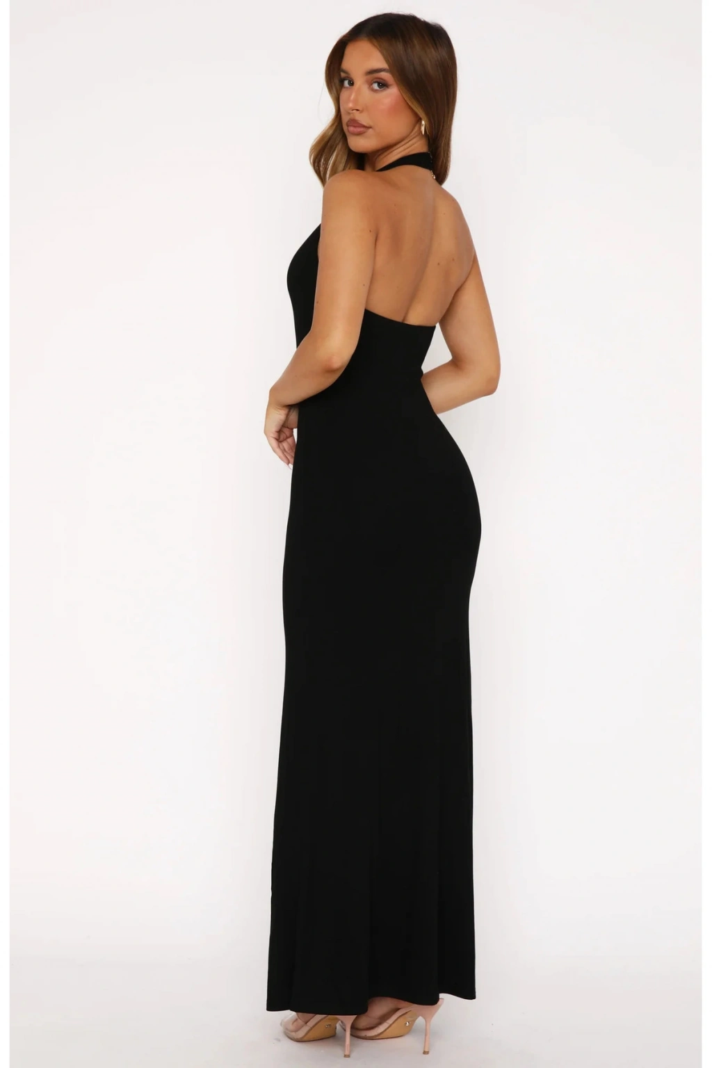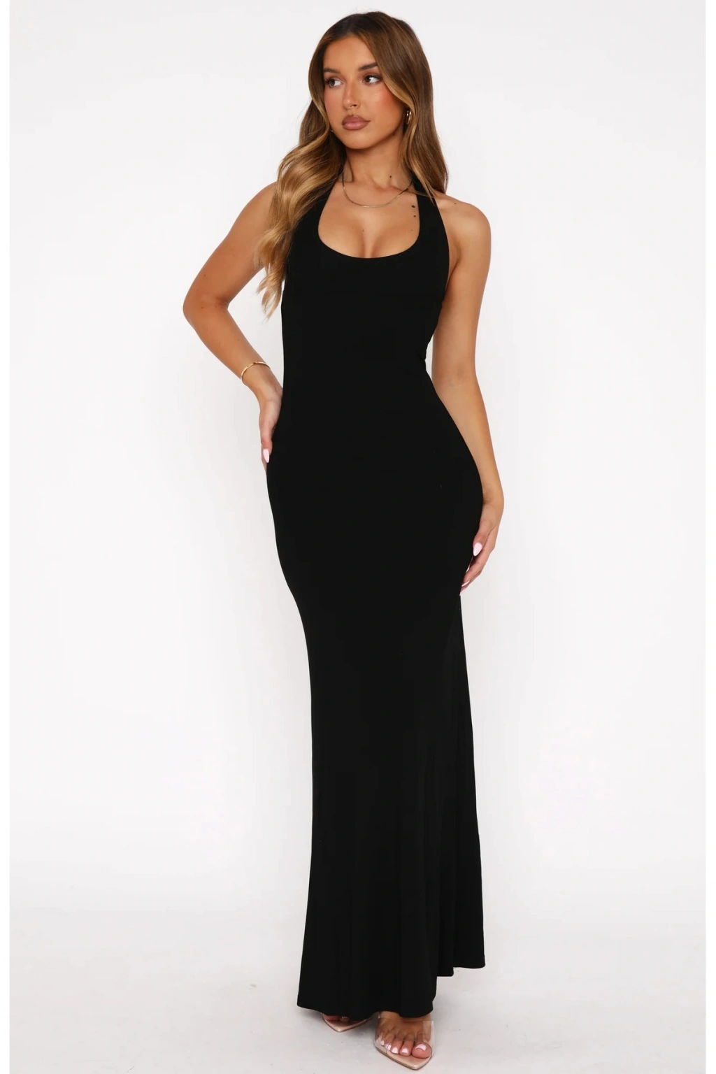 - Vücudu saran slim kesimi ile feminen hatları ön plana çıkaran boyundan bağlamalı elbise, zarif bir siluet sunar.