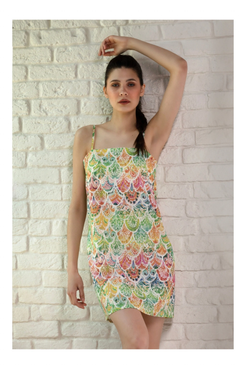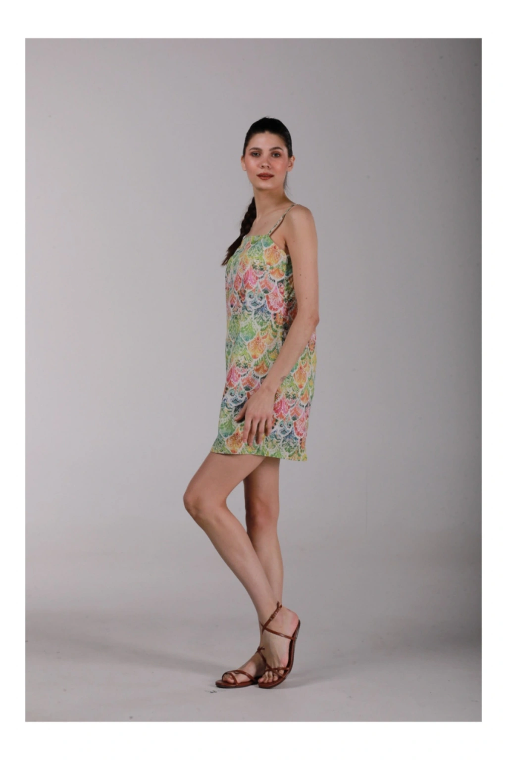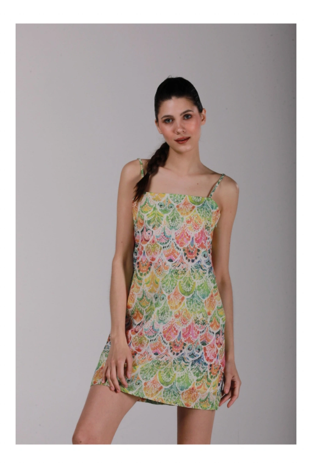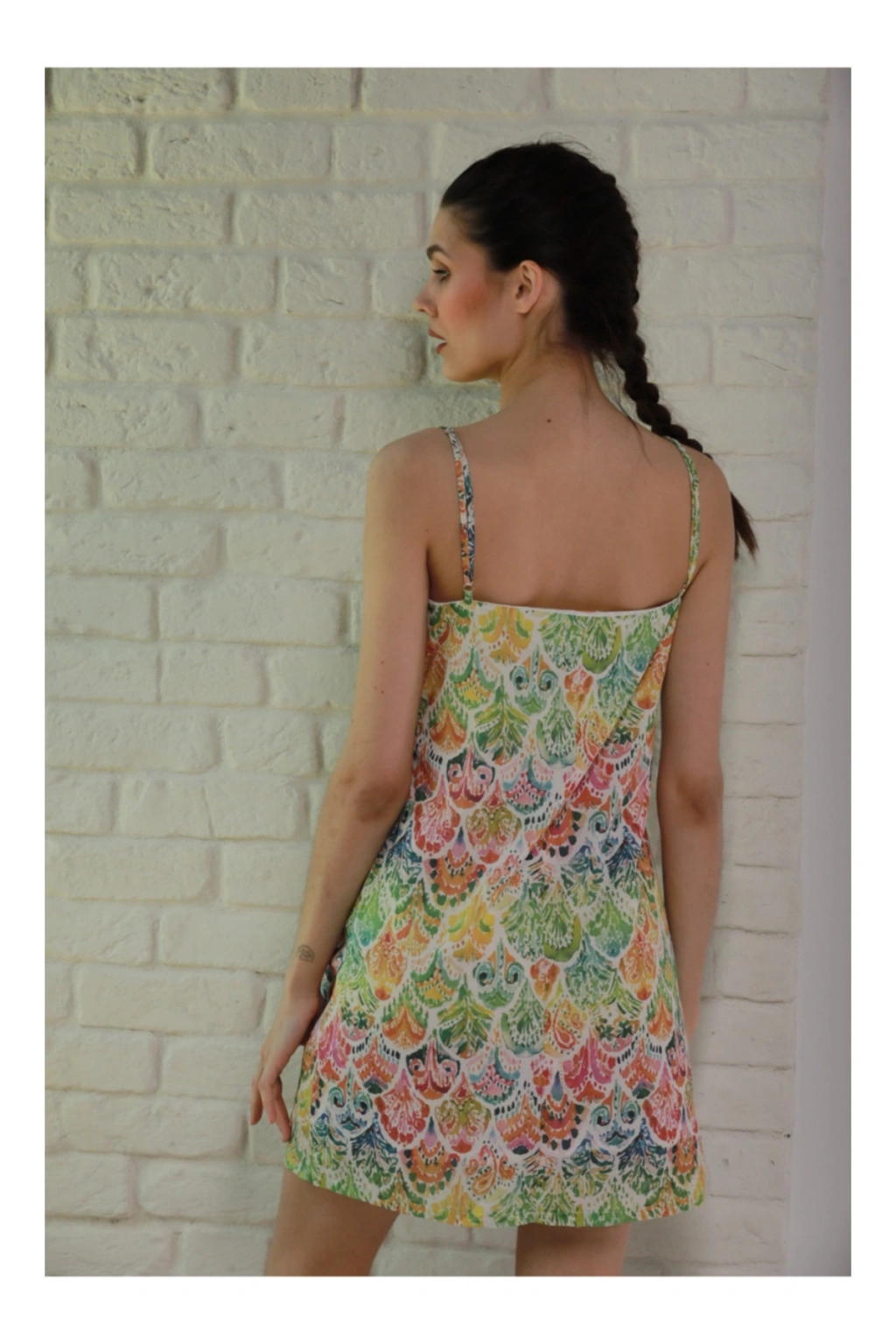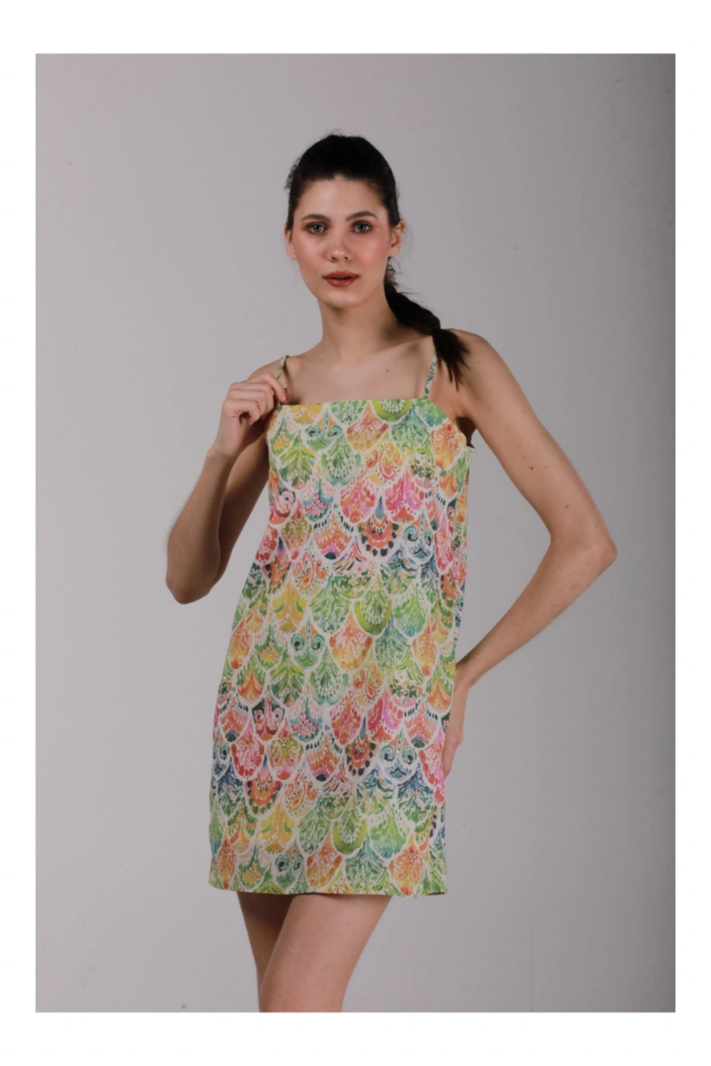 %100 pamuk kumaş, ayarlanabilir askılı ve astarlı mini elbise. ; Yazın rahatlıkla kullanabileceğimiz vücudumuzun nefes aldığı organik kumaştan üretilmiştir. ; Çevreye dost organik özel baskı yapılmıştır. ; %100 pamuk(vual)hafif,rahat yaz için oldukça kullanışlı bir tekstil ürünüdür. ; Önerimiz: Kumaş rengini şeklini ve yapısını korumak amaçlı düşük sıcaklık ve düşük devirde yıkama yapılmasını öneririz. ; ÖLÇÜLER S-M beden M-L beden Göğüs 90 cm Göğüs 98 cm Kalça 102 cm Kalça 107 cm Elbise boyu(askılar hariç) 70 cm Elbise boyu (askılar hariç) 70 cm;