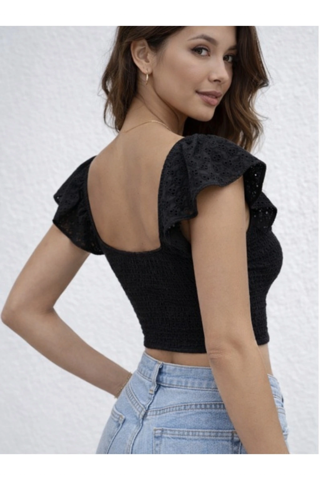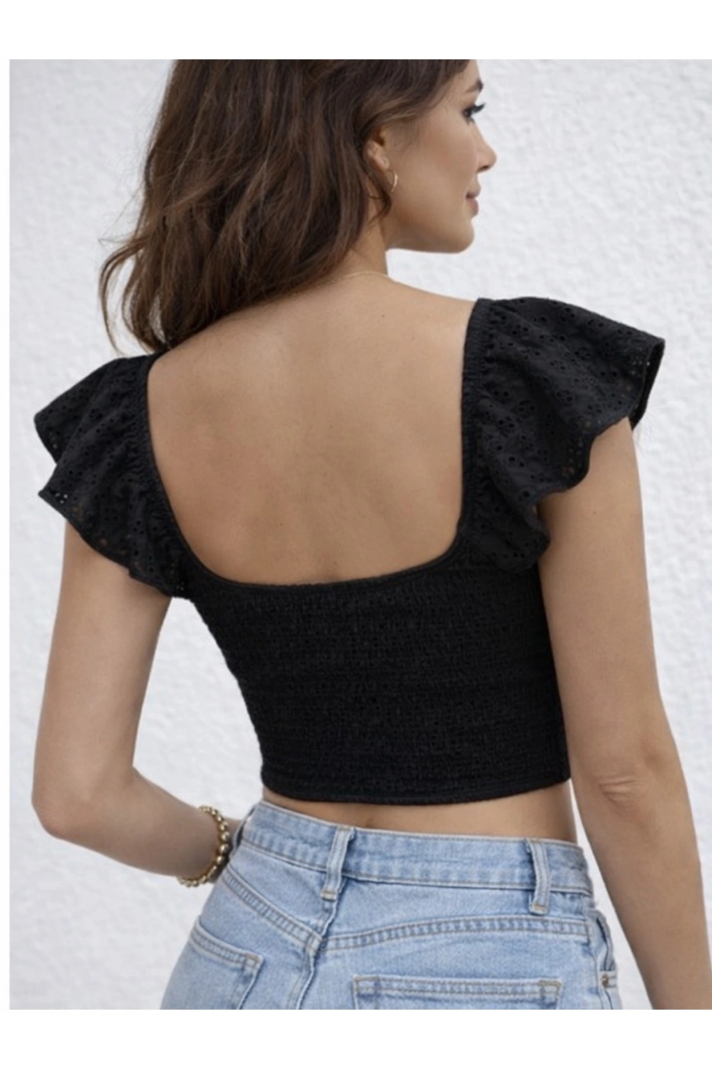 - Şık ve modern tasarımıyla dikkat çeken brode nakışlı siyah crop bluz, günlük kullanıma uygun casual bir stil sunar.; - Kare yaka detayı ve fırfırlı kollar ile feminen bir görünüm kazandırırken, crop silueti ile genç ve dinamik bir hava yaratır.; - Esnek fit yapısı sayesinde rahat bir kullanım sağlarken, ince ve hafif kumaşı yaz aylarında serinlik hissi verir.; - Broderie ek özelliği ile zenginleştirilmiş düz deseni, sade ama etkileyici bir görünüm sunar.; - Türkiye'de üretilen bu ürün, yerel üretimden yana tercih edenler için idealdir.; - Tüm sezonlar için uygun olan bu crop bluz, gardırobunuzun vazgeçilmez parçası haline gelebilir.;