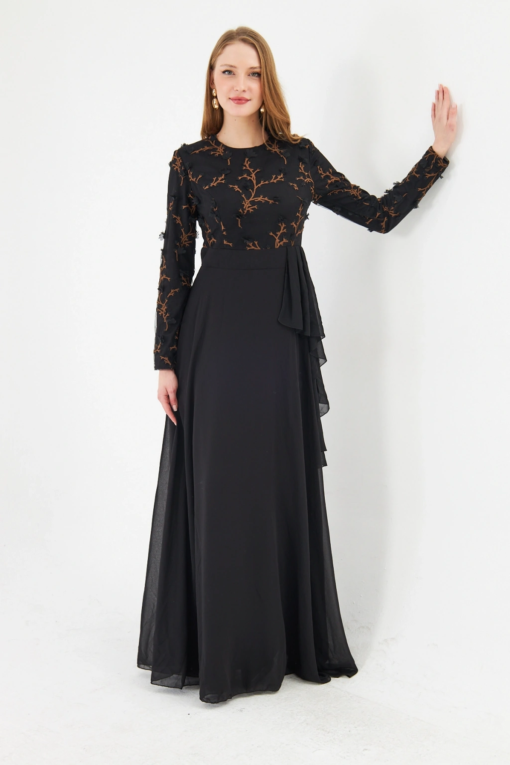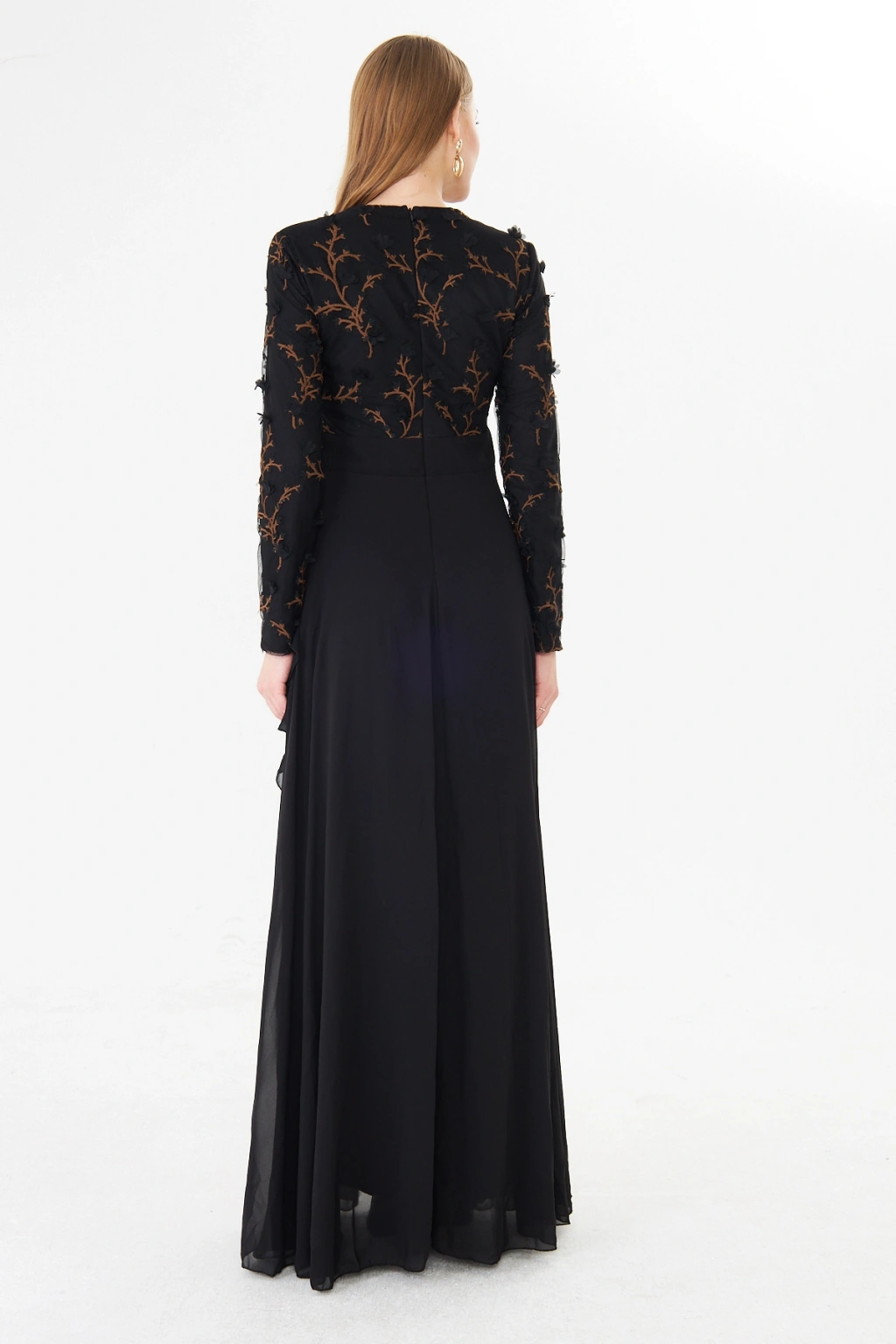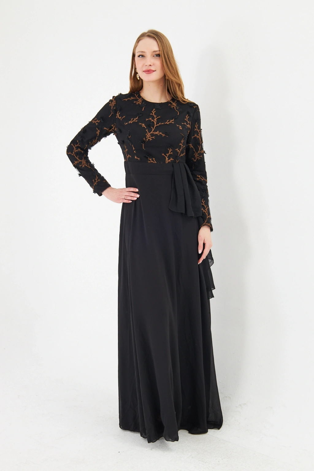 - Şık ve modern tasarımıyla dikkat çeken bu elbise, bisiklet yakası ve uzun kolları ile zarif bir görünüm sunar.; - Asimetrik silueti sayesinde farklı bir tarz yaratırken, maxi boyu ile feminen bir duruş sergiler.; - Jakarlı deseni ve tül dokusu, elbiseye sofistike bir hava katar ve özel günlerde göz alıcı bir stil oluşturmanızı sağlar.; - Tesettür giyim koleksiyonuna özel olarak tasarlanmış bu elbise, şıklığı ve rahatlığı bir arada sunar.; - İç göstermeyen yapısı sayesinde rahatlıkla tercih edebileceğiniz bu elbise, astarlı olmasıyla konforlu bir kullanım sağlar.; - Yarım pat fermuar kapama şekli, kolay giyilip çıkarılmasını mümkün kılar ve pratik bir kullanım sunar.; - Kemer detayı ile belinizi vurgulayan bu elbise, regular kalıbı sayesinde vücut hatlarınıza uyum sağlar.; - Tüm sezonlar için uygun olan bu elbise, her mevsimde şıklığınızdan ödün vermeden tercih edebileceğiniz bir parçadır.; - Dokuma kumaş tipi, dayanıklılığı ve kalitesiyle uzun süreli kullanım vaat eder.;