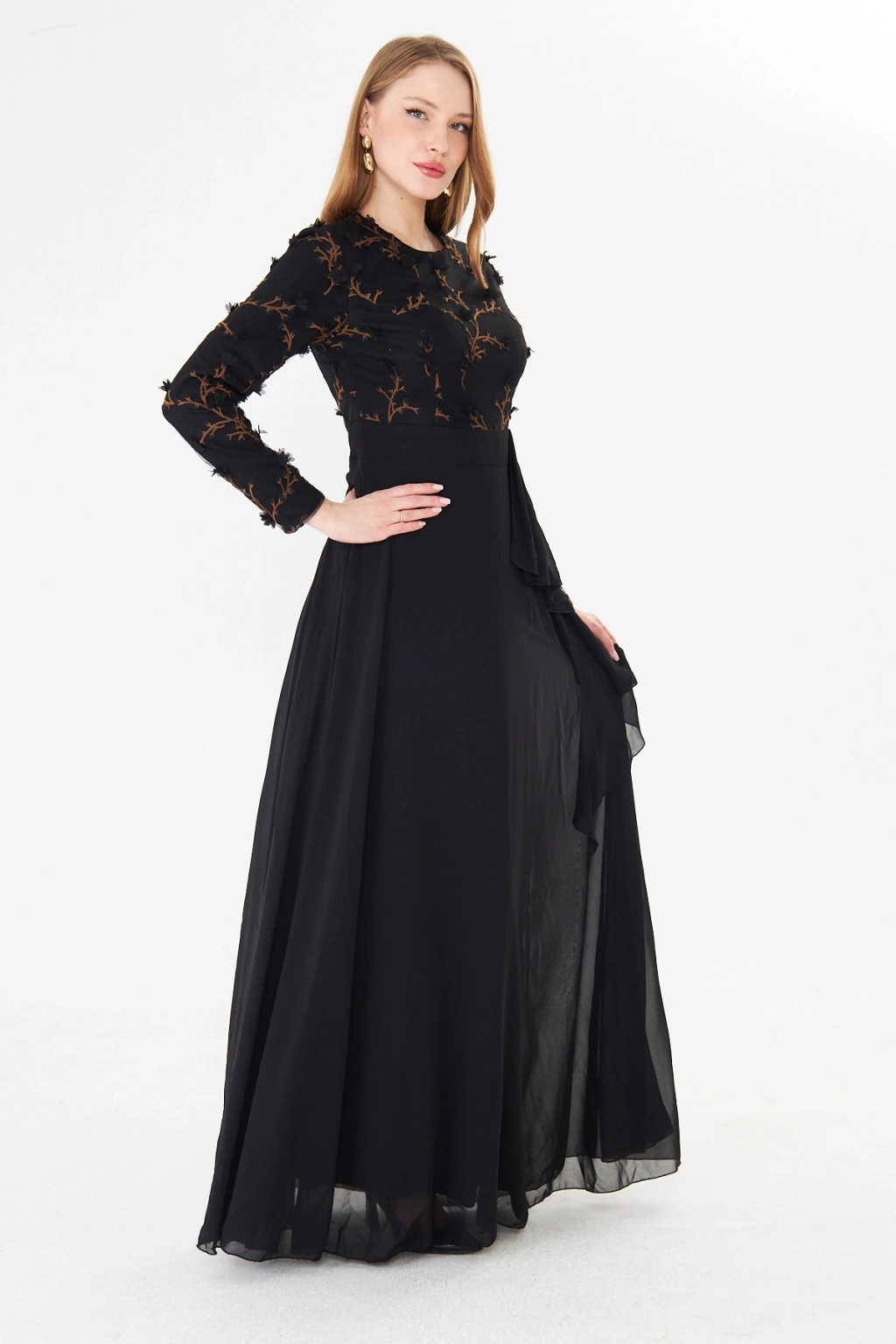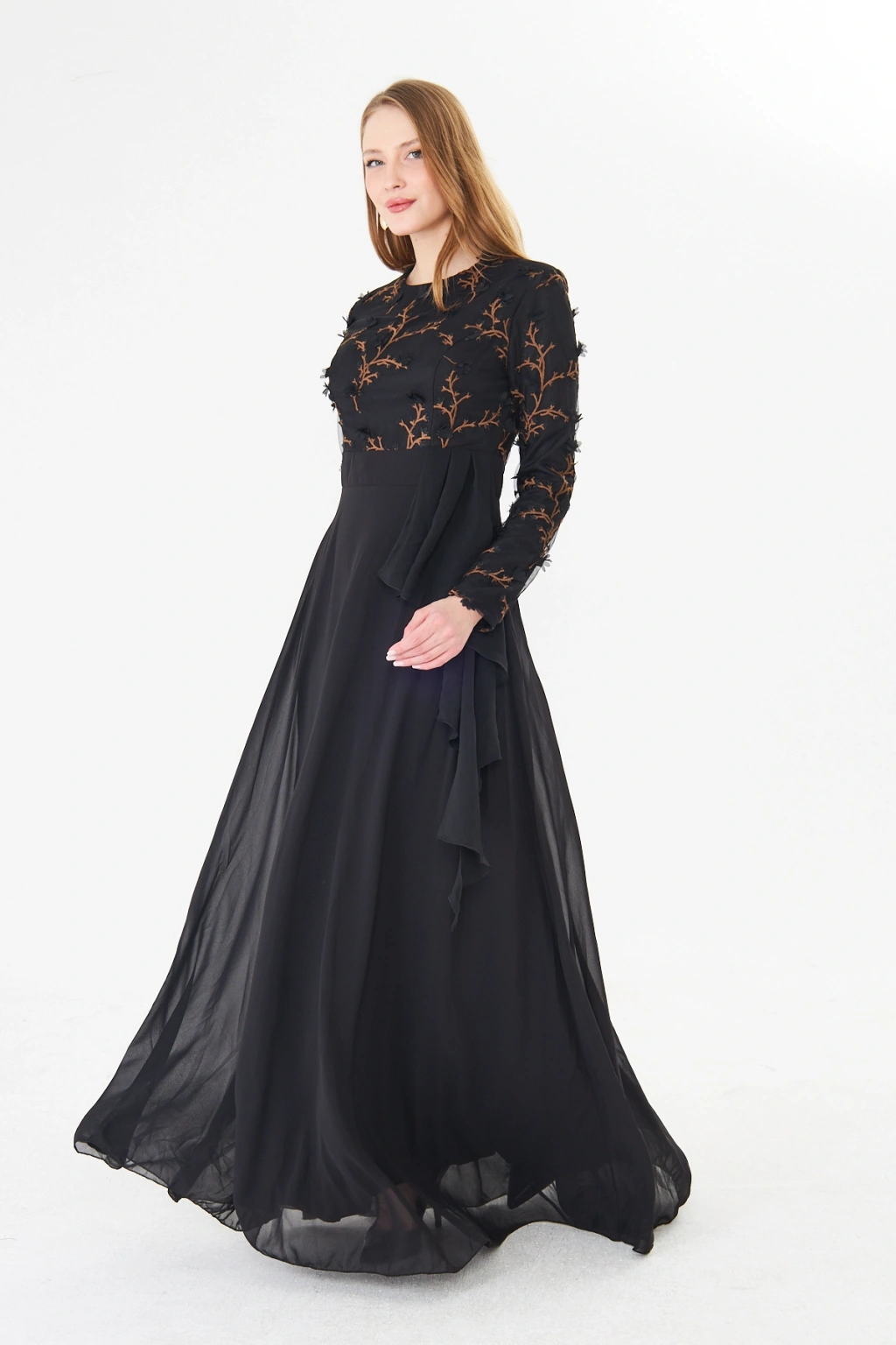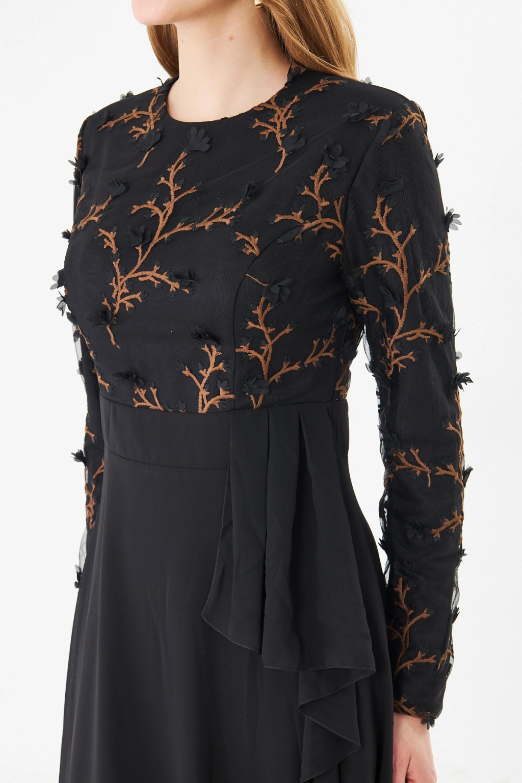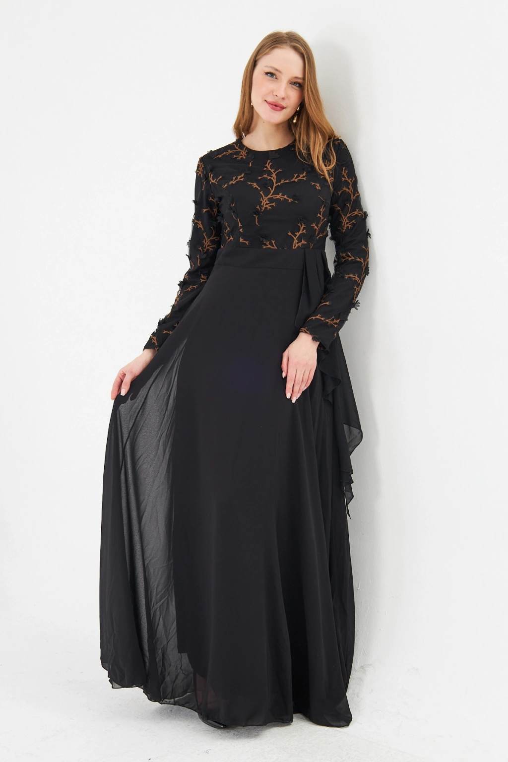 - Şık ve modern tasarımıyla dikkat çeken bu elbise, bisiklet yakası ve uzun kolları ile zarif bir görünüm sunar.; - Asimetrik silueti sayesinde farklı bir tarz yaratırken, maxi boyu ile feminen bir duruş sergiler.; - Jakarlı deseni ve tül dokusu, elbiseye sofistike bir hava katar ve özel günlerde göz alıcı bir stil oluşturmanızı sağlar.; - Tesettür giyim koleksiyonuna özel olarak tasarlanmış bu elbise, şıklığı ve rahatlığı bir arada sunar.; - İç göstermeyen yapısı sayesinde rahatlıkla tercih edebileceğiniz bu elbise, astarlı olmasıyla konforlu bir kullanım sağlar.; - Yarım pat fermuar kapama şekli, kolay giyilip çıkarılmasını mümkün kılar ve pratik bir kullanım sunar.; - Kemer detayı ile belinizi vurgulayan bu elbise, regular kalıbı sayesinde vücut hatlarınıza uyum sağlar.; - Tüm sezonlar için uygun olan bu elbise, her mevsimde şıklığınızdan ödün vermeden tercih edebileceğiniz bir parçadır.; - Dokuma kumaş tipi, dayanıklılığı ve kalitesiyle uzun süreli kullanım vaat eder.;