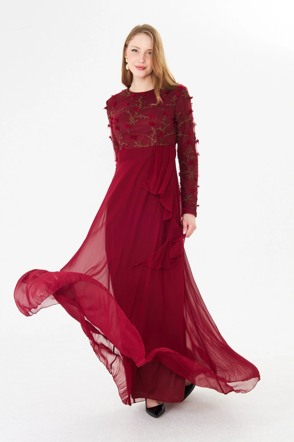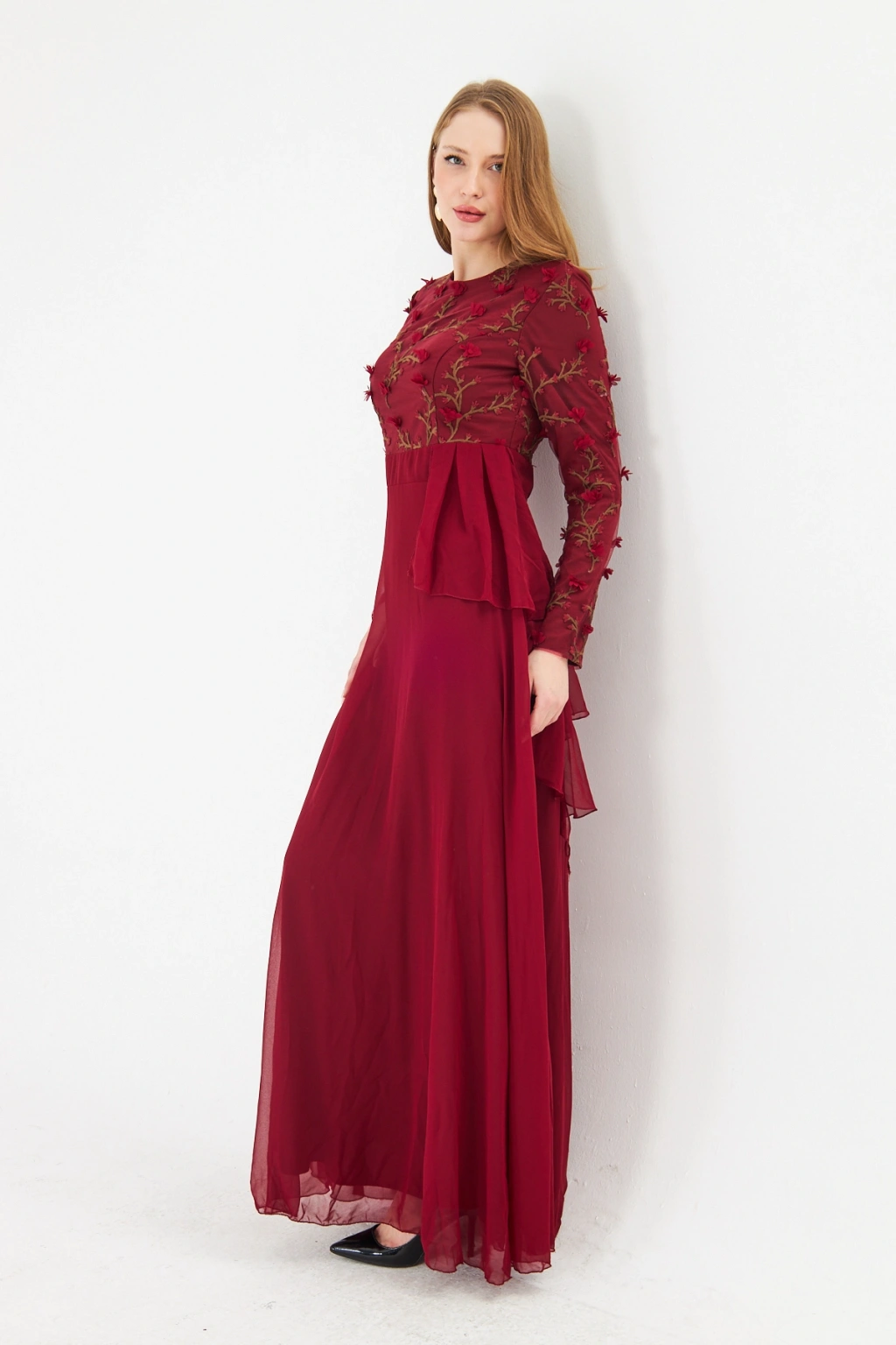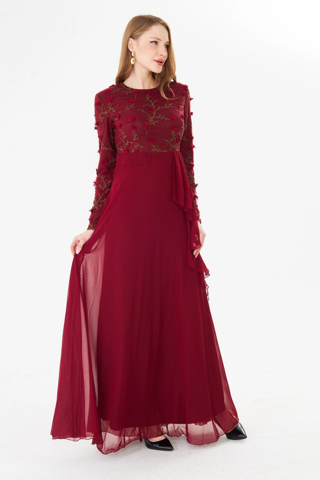 - Şık ve modern tasarımıyla dikkat çeken bu elbise, bisiklet yakası ve uzun kolları ile zarif bir görünüm sunar.; - Asimetrik silueti sayesinde farklı bir tarz yaratırken, maxi boyu ile feminen bir duruş sergiler.; - Jakarlı deseni ve tül dokusu, elbiseye sofistike bir hava katar ve özel günlerde göz alıcı bir stil oluşturmanızı sağlar.; - Tesettür giyim koleksiyonuna özel olarak tasarlanmış bu elbise, şıklığı ve rahatlığı bir arada sunar.; - İç göstermeyen yapısı sayesinde rahatlıkla tercih edebileceğiniz bu elbise, astarlı olmasıyla konforlu bir kullanım sağlar.; - Yarım pat fermuar kapama şekli, kolay giyilip çıkarılmasını mümkün kılar ve pratik bir kullanım sunar.; - Kemer detayı ile belinizi vurgulayan bu elbise, regular kalıbı sayesinde vücut hatlarınıza uyum sağlar.; - Tüm sezonlar için uygun olan bu elbise, her mevsimde şıklığınızdan ödün vermeden tercih edebileceğiniz bir parçadır.; - Dokuma kumaş tipi, dayanıklılığı ve kalitesiyle uzun süreli kullanım vaat eder.;