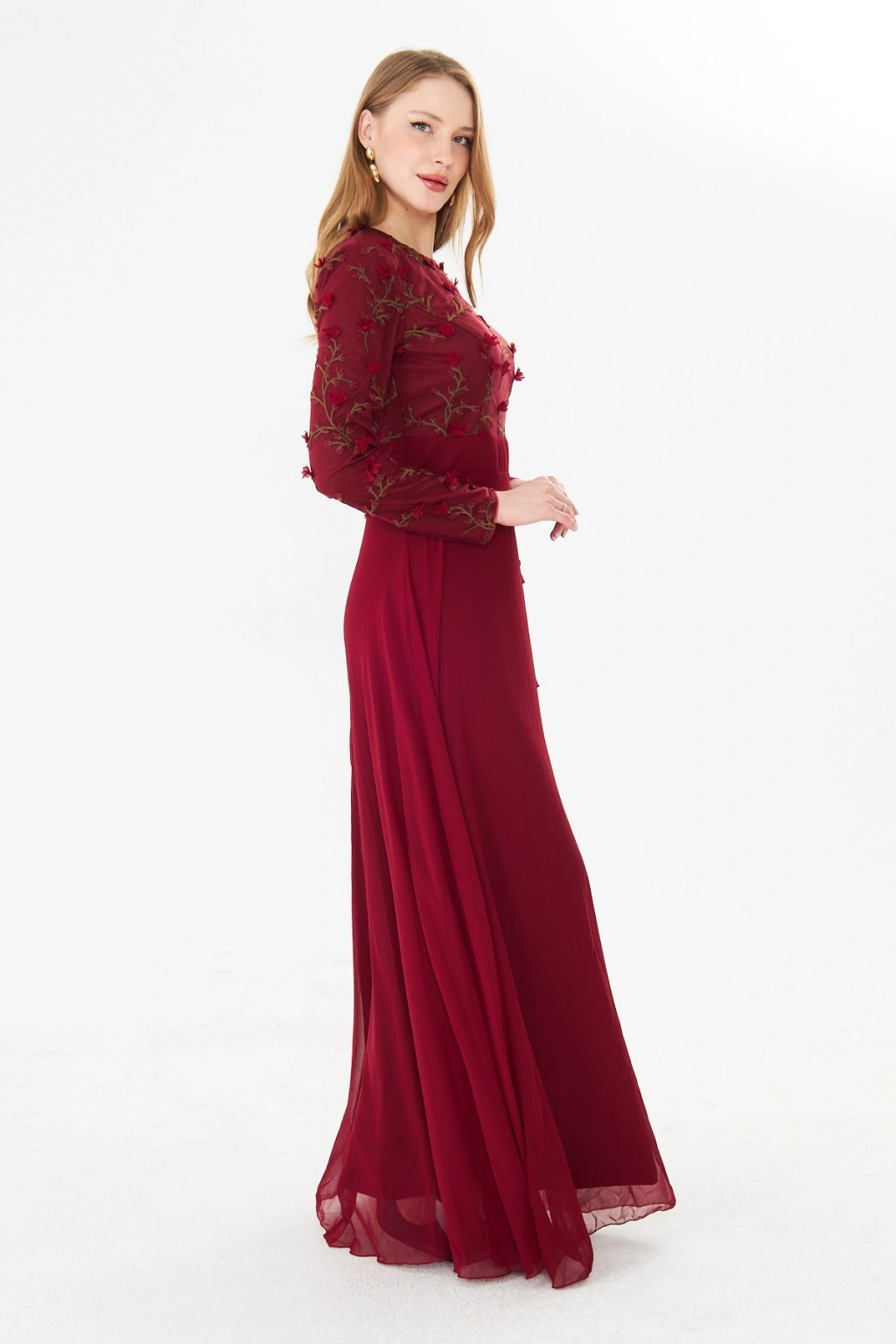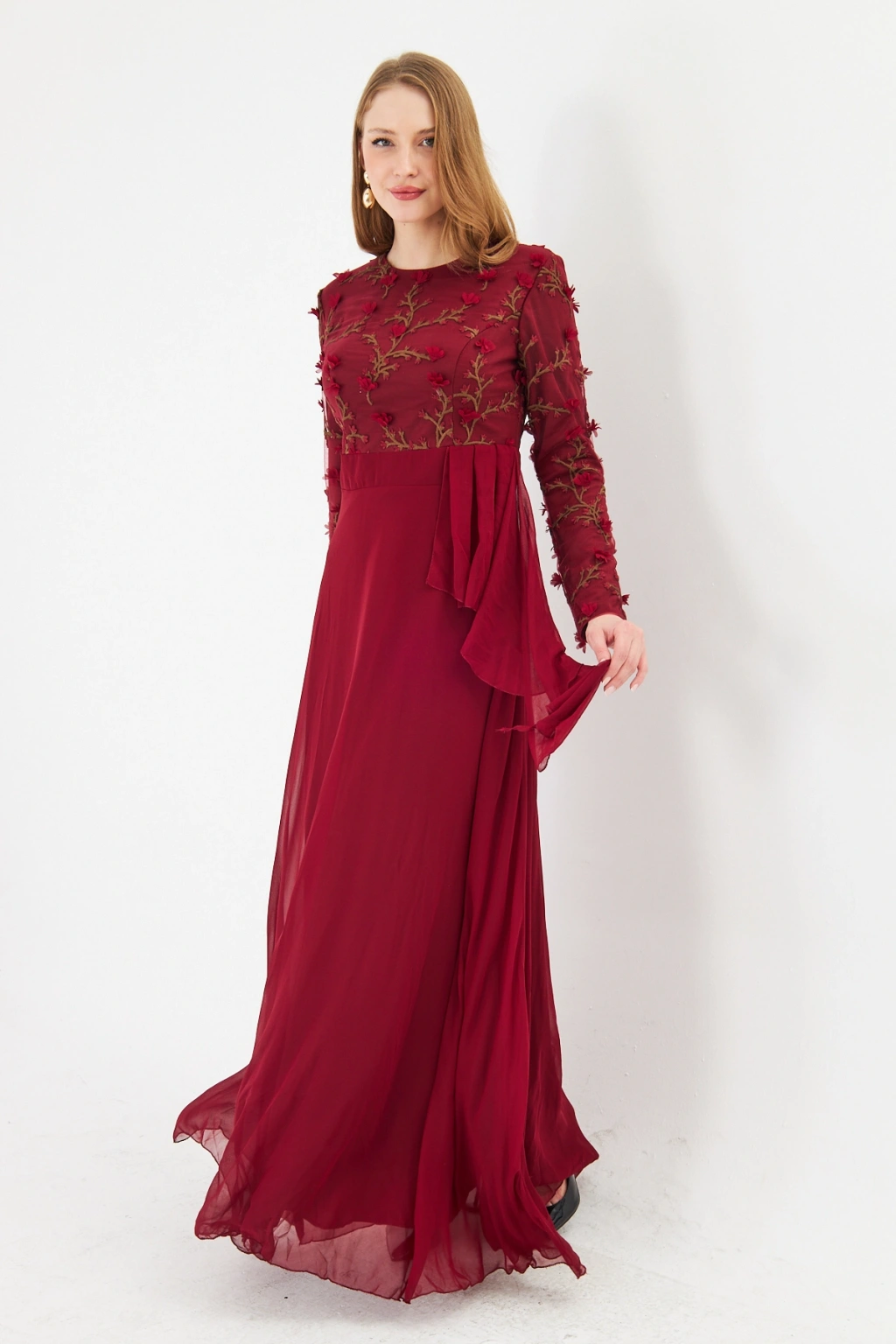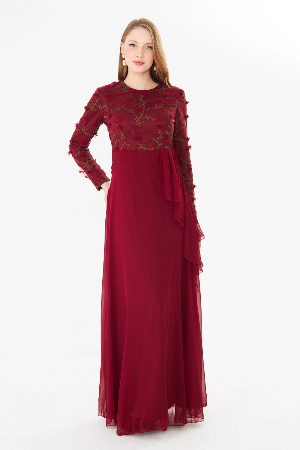 - Şık ve modern tasarımıyla dikkat çeken bu elbise, bisiklet yakası ve uzun kolları ile zarif bir görünüm sunar.; - Asimetrik silueti sayesinde farklı bir tarz yaratırken, maxi boyu ile feminen bir duruş sergiler.; - Jakarlı deseni ve tül dokusu, elbiseye sofistike bir hava katar ve özel günlerde göz alıcı bir stil oluşturmanızı sağlar.; - Tesettür giyim koleksiyonuna özel olarak tasarlanmış bu elbise, şıklığı ve rahatlığı bir arada sunar.; - İç göstermeyen yapısı sayesinde rahatlıkla tercih edebileceğiniz bu elbise, astarlı olmasıyla konforlu bir kullanım sağlar.; - Yarım pat fermuar kapama şekli, kolay giyilip çıkarılmasını mümkün kılar ve pratik bir kullanım sunar.; - Kemer detayı ile belinizi vurgulayan bu elbise, regular kalıbı sayesinde vücut hatlarınıza uyum sağlar.; - Tüm sezonlar için uygun olan bu elbise, her mevsimde şıklığınızdan ödün vermeden tercih edebileceğiniz bir parçadır.; - Dokuma kumaş tipi, dayanıklılığı ve kalitesiyle uzun süreli kullanım vaat eder.;