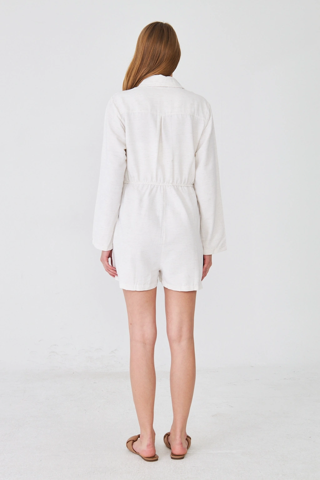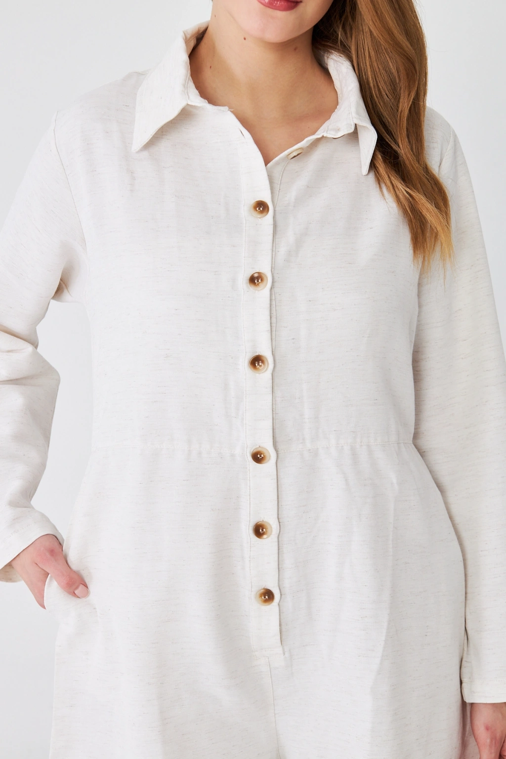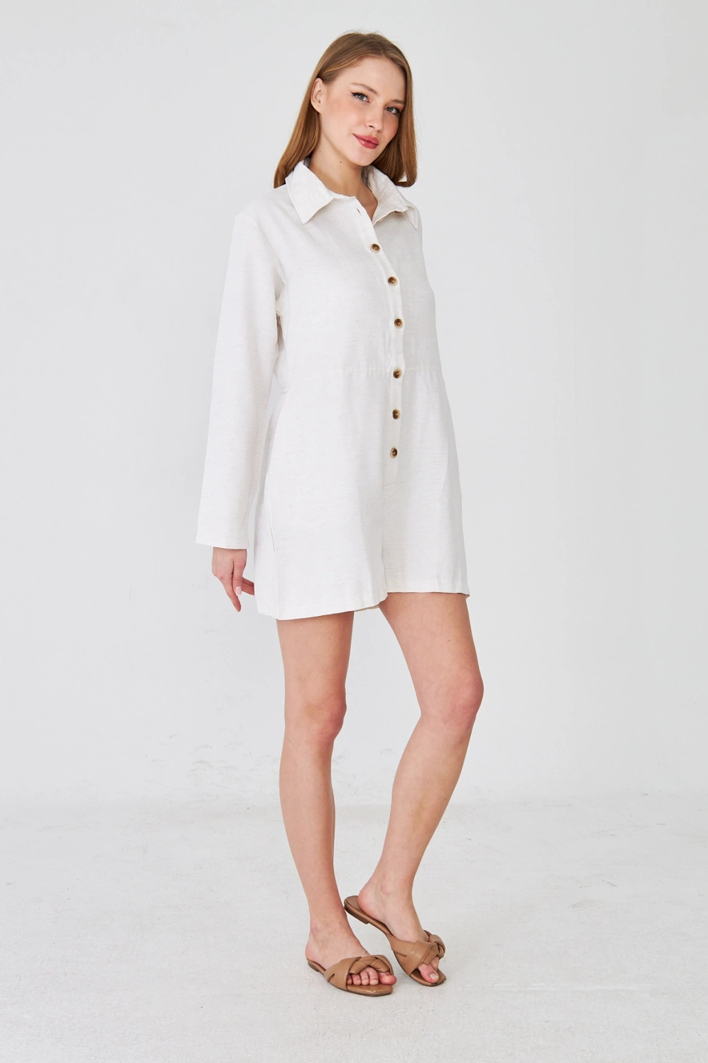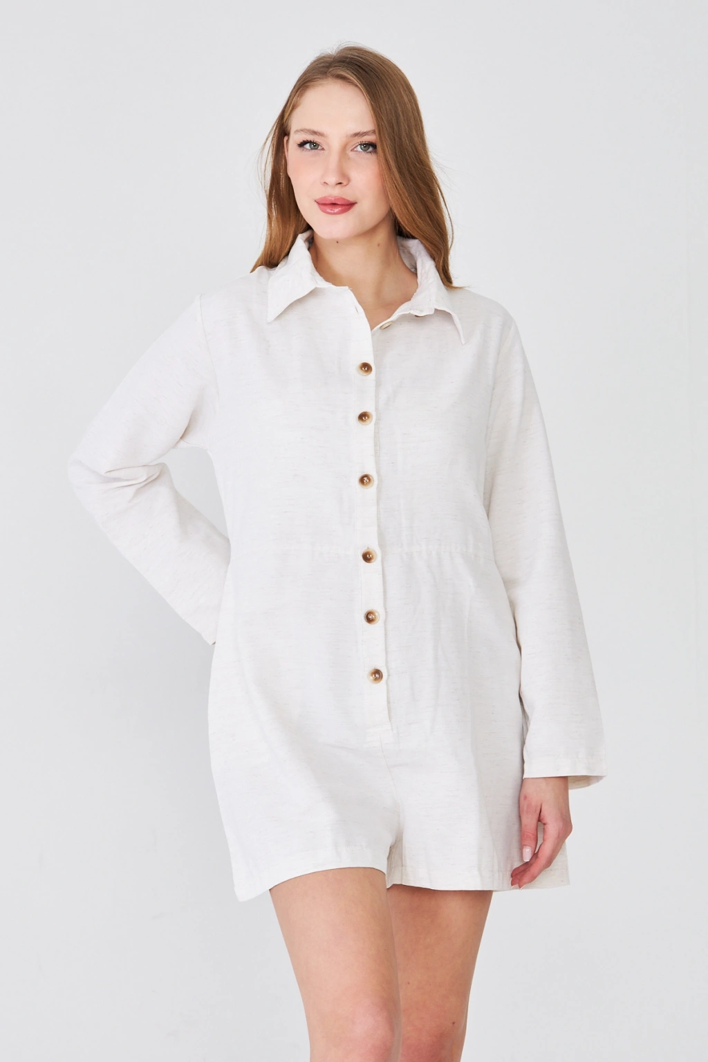 - Tüm mevsimlerde rahatlıkla tercih edebileceğiniz, uzun kollu ve keten şortlu tasarımıyla dikkat çeken kadın tulum.; - Cool & Comfort persona ile günlük kullanım için ideal, düz ve basic siluetiyle şıklığı ve rahatlığı bir arada sunar.; - Düz paça kesimi sayesinde modern ve sade bir görünüm sağlar.; - Flamlı pamuk dokuma tipi, yumuşak dokusuyla cildinize nazik bir dokunuş sunar.; - Kemersiz tasarımı ile belden büzgü detayı, vücut hatlarınızı zarifçe vurgular.; - Tüylenmez özelliği ile uzun süreli kullanımda bile formunu korur ve ilk günkü gibi kalır.; - Gömlek yaka detayı, tulumun şık ve klasik havasını ön plana çıkarır.; - Slim kalıp, vücudu saran yapısıyla modern bir siluet oluştururken, kısa boyu hareket özgürlüğü sağlar.; - Yetişkin kadınlar için özel olarak tasarlanmış bu tulum, trend ortamlarda stilinizi yansıtmanızı sağlar.;