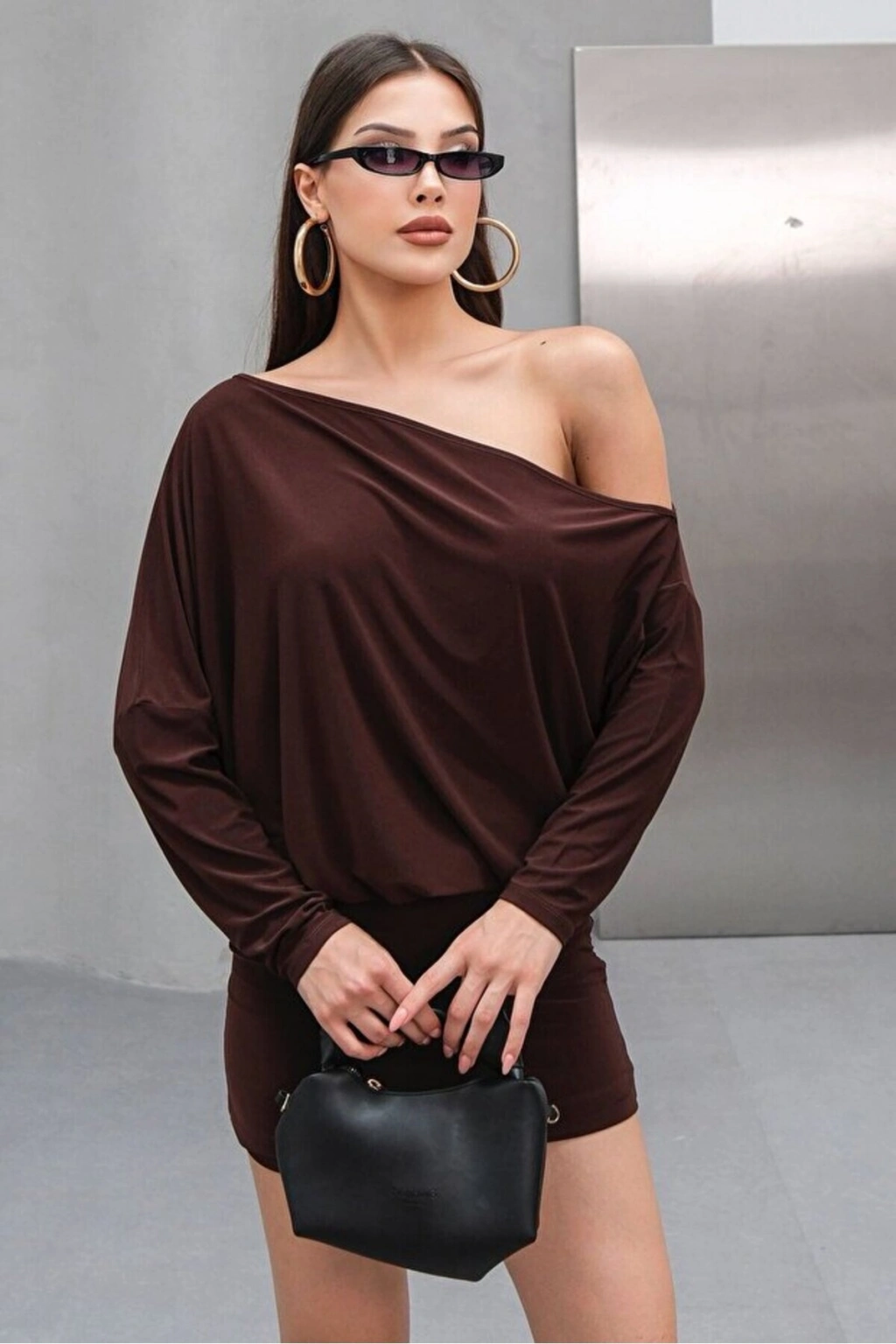Asimetrik Yaka Düşük Omuz Detaylı Uzun Kollu Likralı Elbise ( Mevsimlik ve Kışlık )
