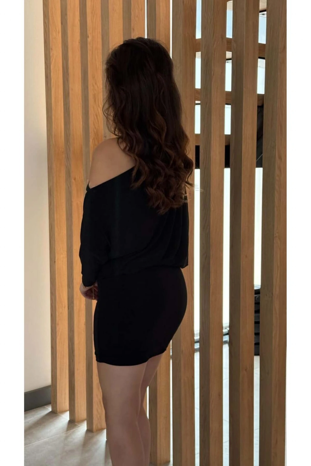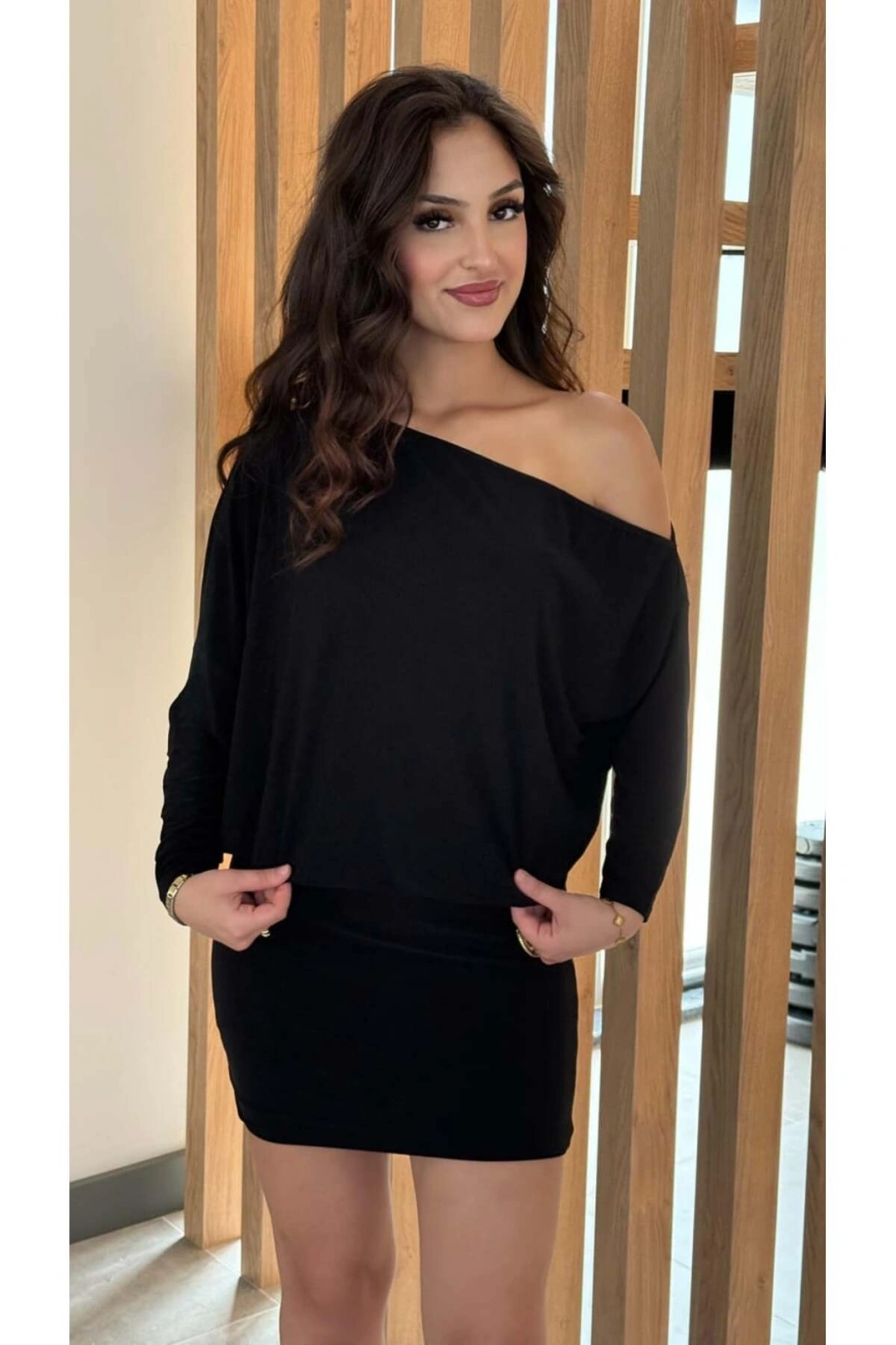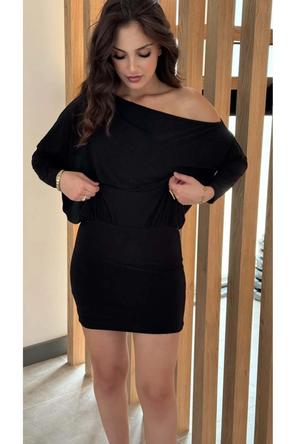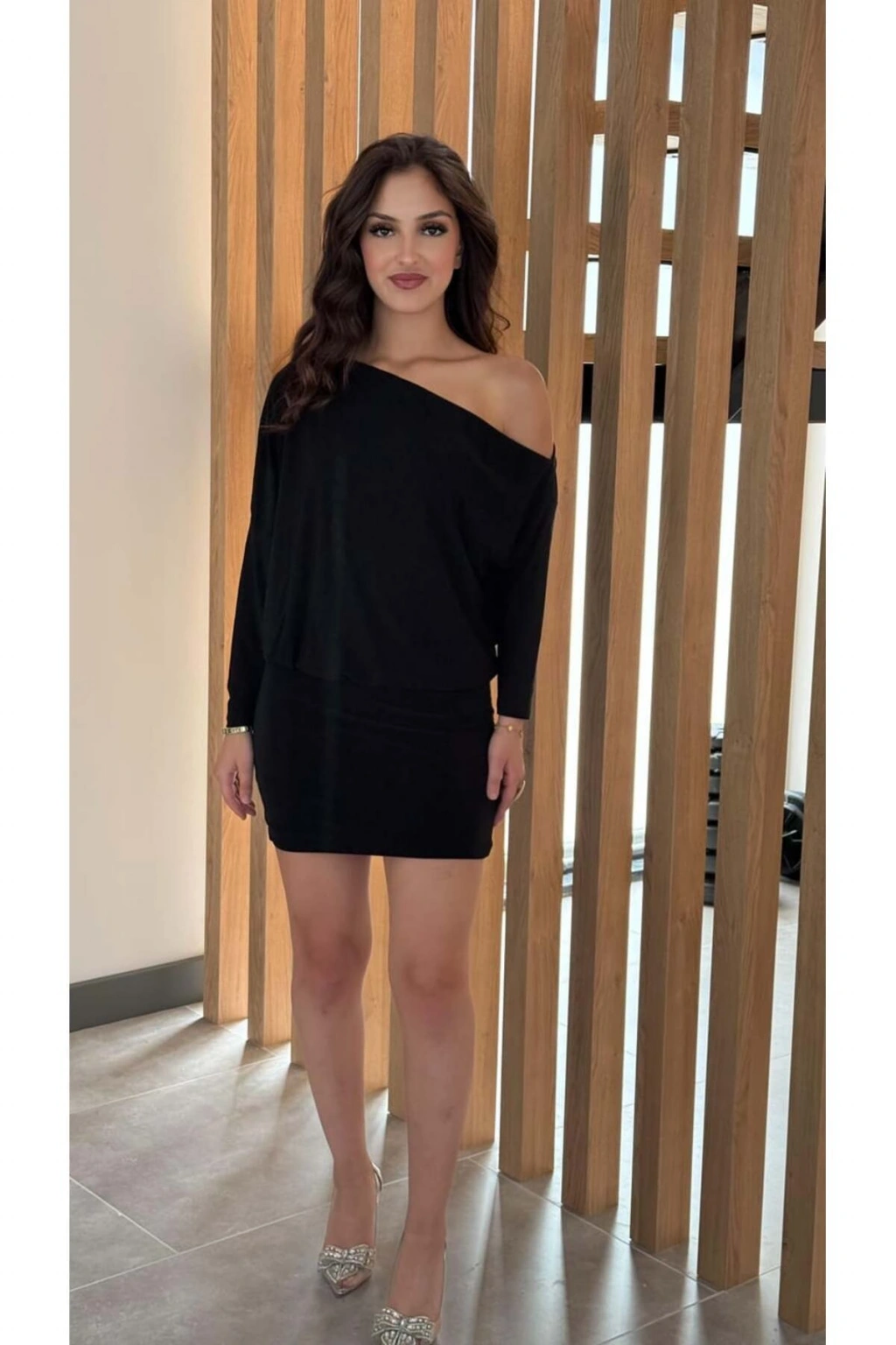 Asimetrik Yaka Düşük Omuz Detaylı Uzun Kollu Likralı Elbise ( Mevsimlik ve Kışlık )