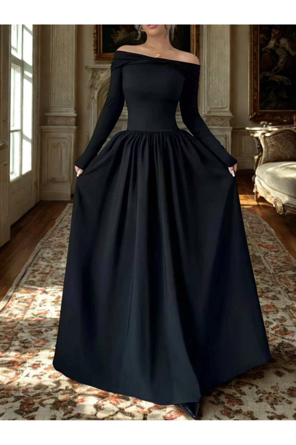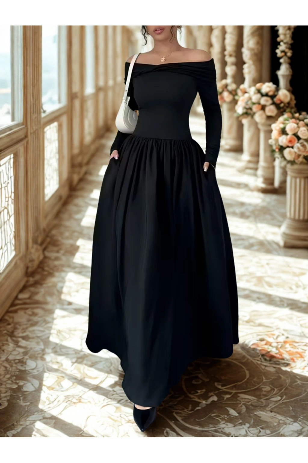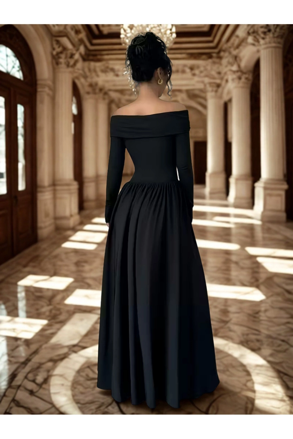 Özel günlerde zarafetiyle öne çıkmak isteyen kadınlar için tasarlandı. Omuz dekolteli, uzun kollu ve yere kadar uzanan etek yapısıyla şık ve asil bir görünüm sağlar.”