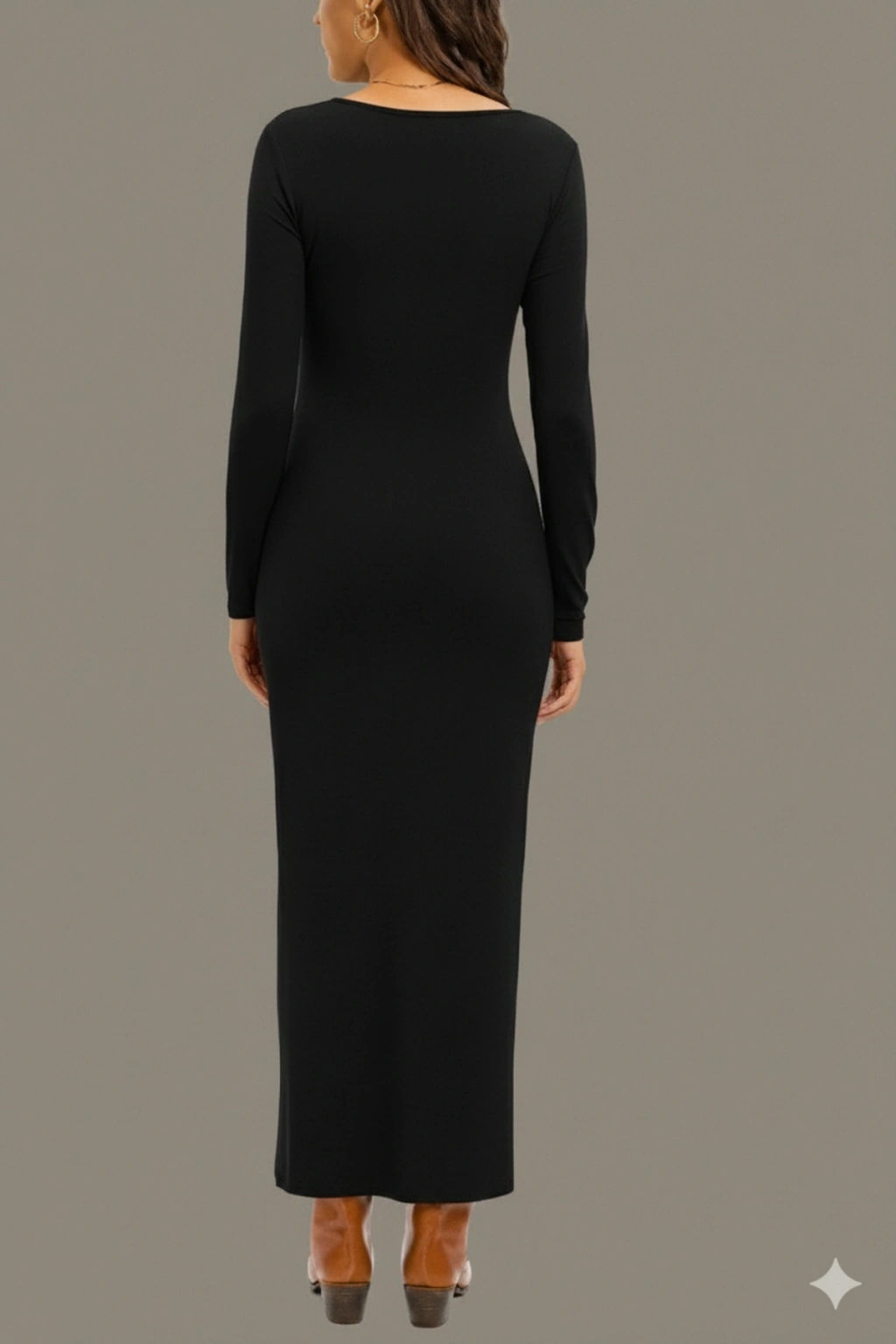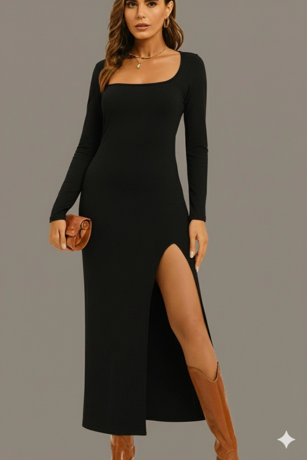 Kare Yaka Uzun Kollu Yırtmaçlı Elbise – Esnek Kumaş, Vücuda Oturan Şık Abiye Günlük Elbise