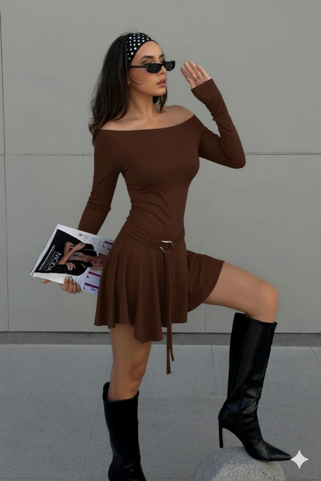 Kayık yaka tasarımı ile omuzları zarif şekilde ortaya çıkaran bu bordo mini elbise, drapeli detayı sayesinde vücuda oturarak feminen bir siluet sunar.; Esnek yapılı kumaşı hareket özgürlüğü sağlar ve gün boyu konforlu kullanım imkânı verir.;