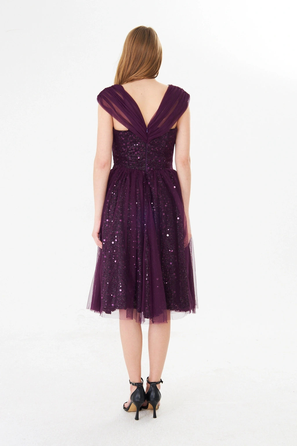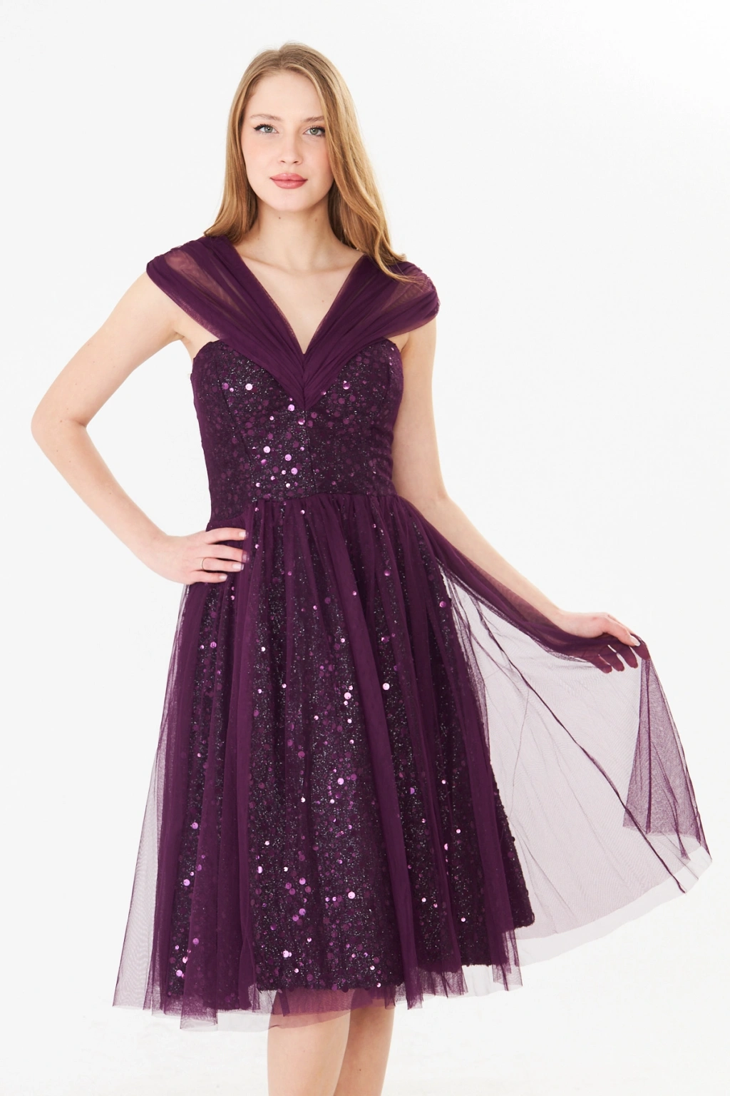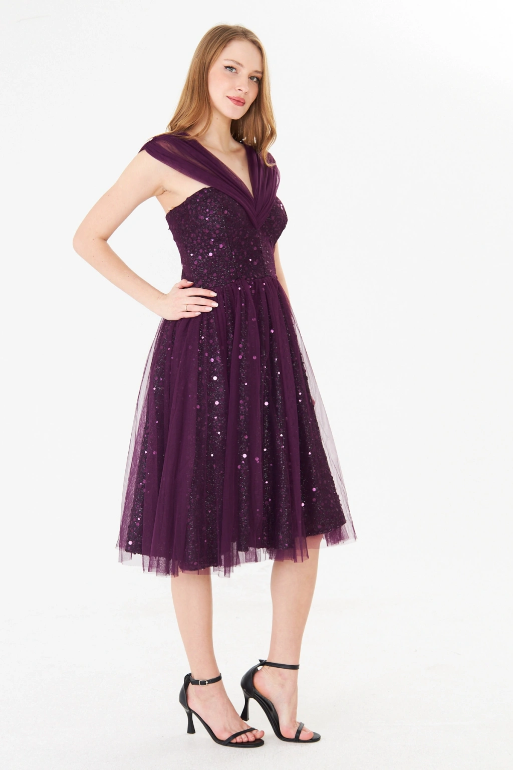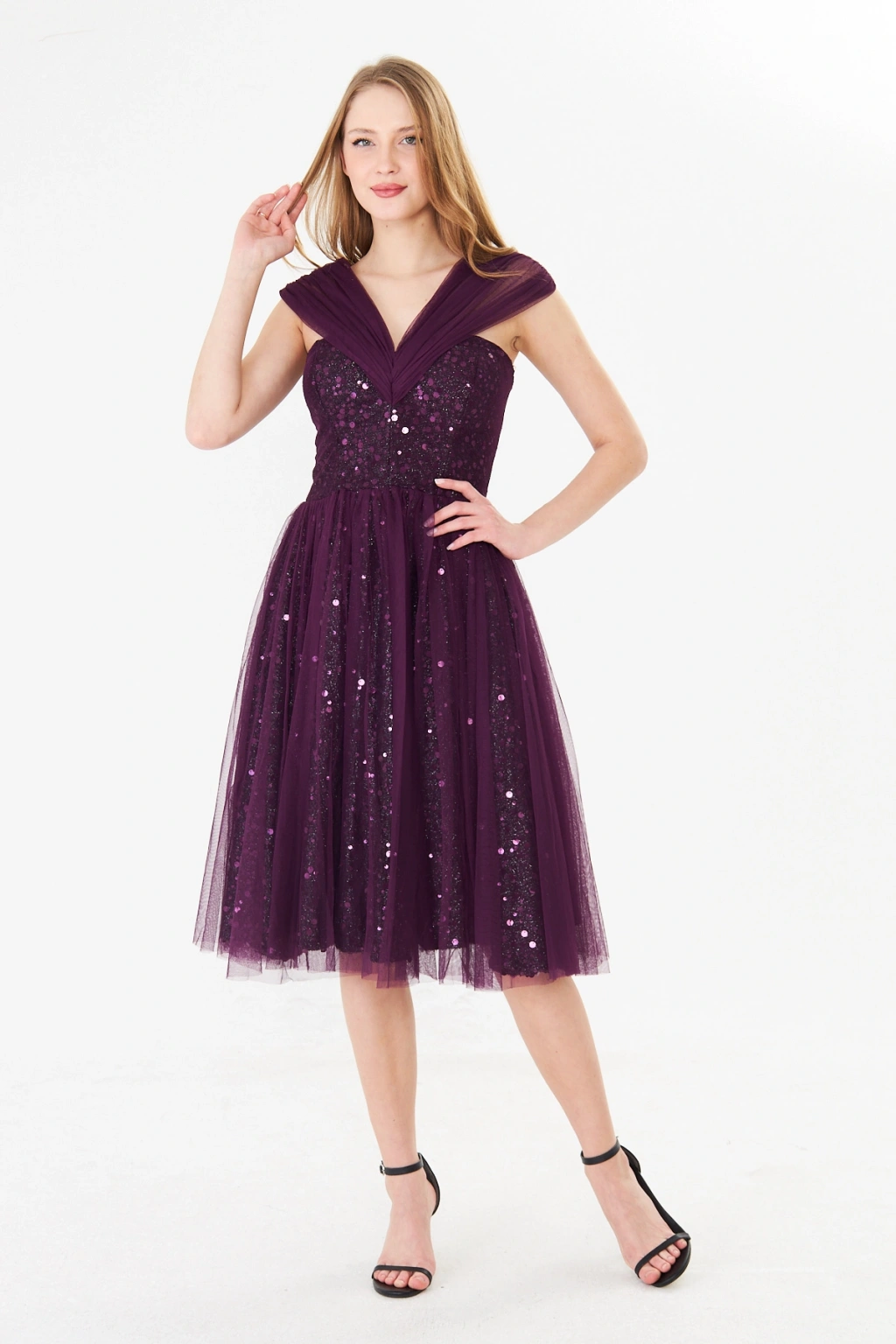 - Zarif kalp yaka tasarımı ile dikkat çeken bu abiye elbise, feminen ve sofistike bir görünüm sunar.; - Mor payet detayları ile ışıltınızı ön plana çıkaran bu elbise, özel gün davetlerinizde göz kamaştırıcı bir stil yaratır.; - Diz altı boyu ve slim silueti ile vücut hatlarınızı zarifçe sararak feminen bir duruş sergiler.; - Kolsuz ve düşük kol tasarımı, omuzlarınızı nazikçe vurgularken rahat hareket etme özgürlüğü sağlar.; - İç göstermeyen astarlı yapısı sayesinde rahatlıkla tercih edebileceğiniz bu elbise, şıklığınızdan ödün vermenize gerek bırakmaz.; - Fermuarlı kapama şekli ile kolayca giyilip çıkartılabilir ve gün boyu konfor sunar.; - Düz deseni ve astarlı dokusu ile sade ama etkileyici bir görünüm elde edersiniz.; - Tüm sezonlarda tercih edebileceğiniz bu midi boy abiye elbise, düğün, nikah gibi özel günlerde vazgeçilmeziniz olacak.;