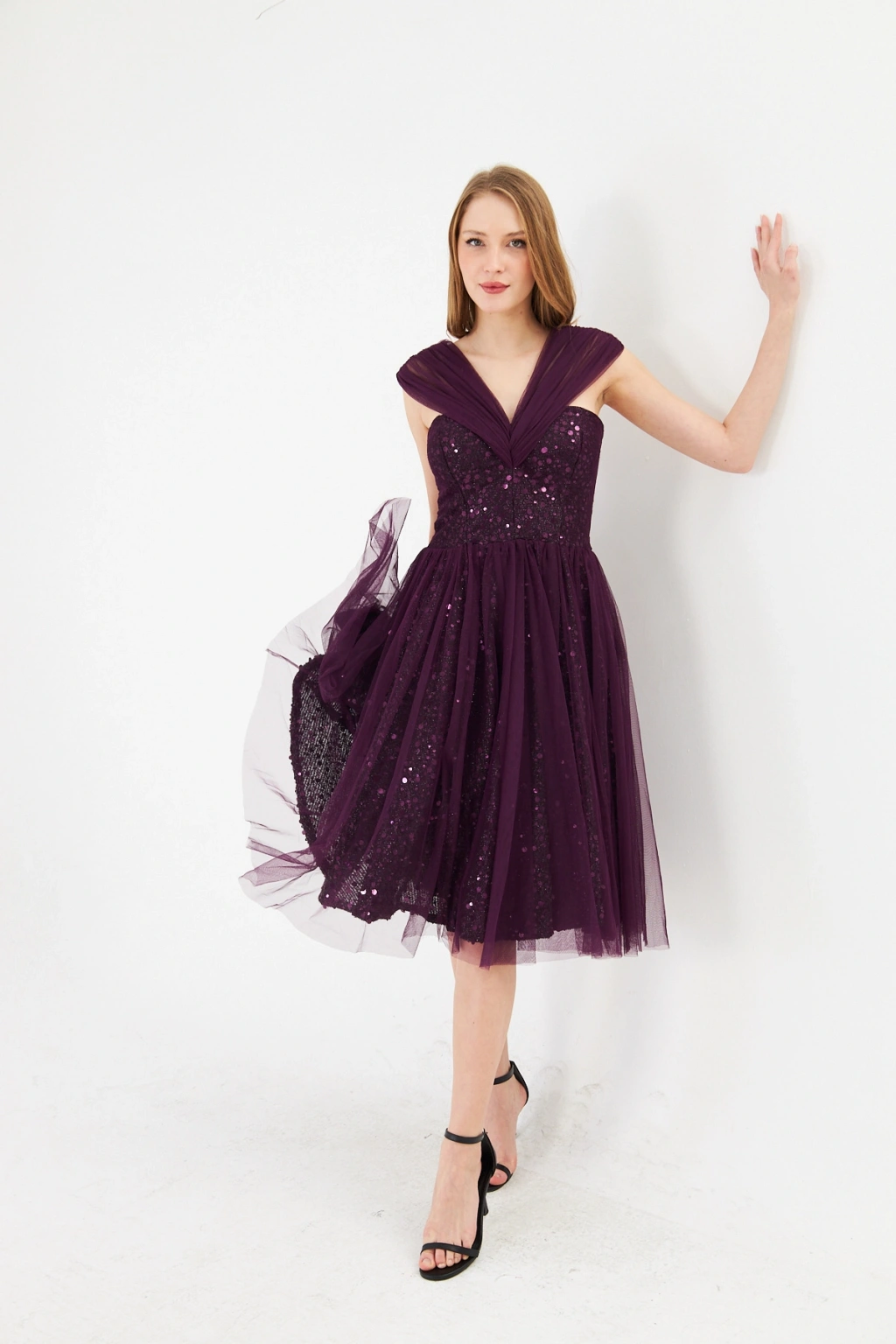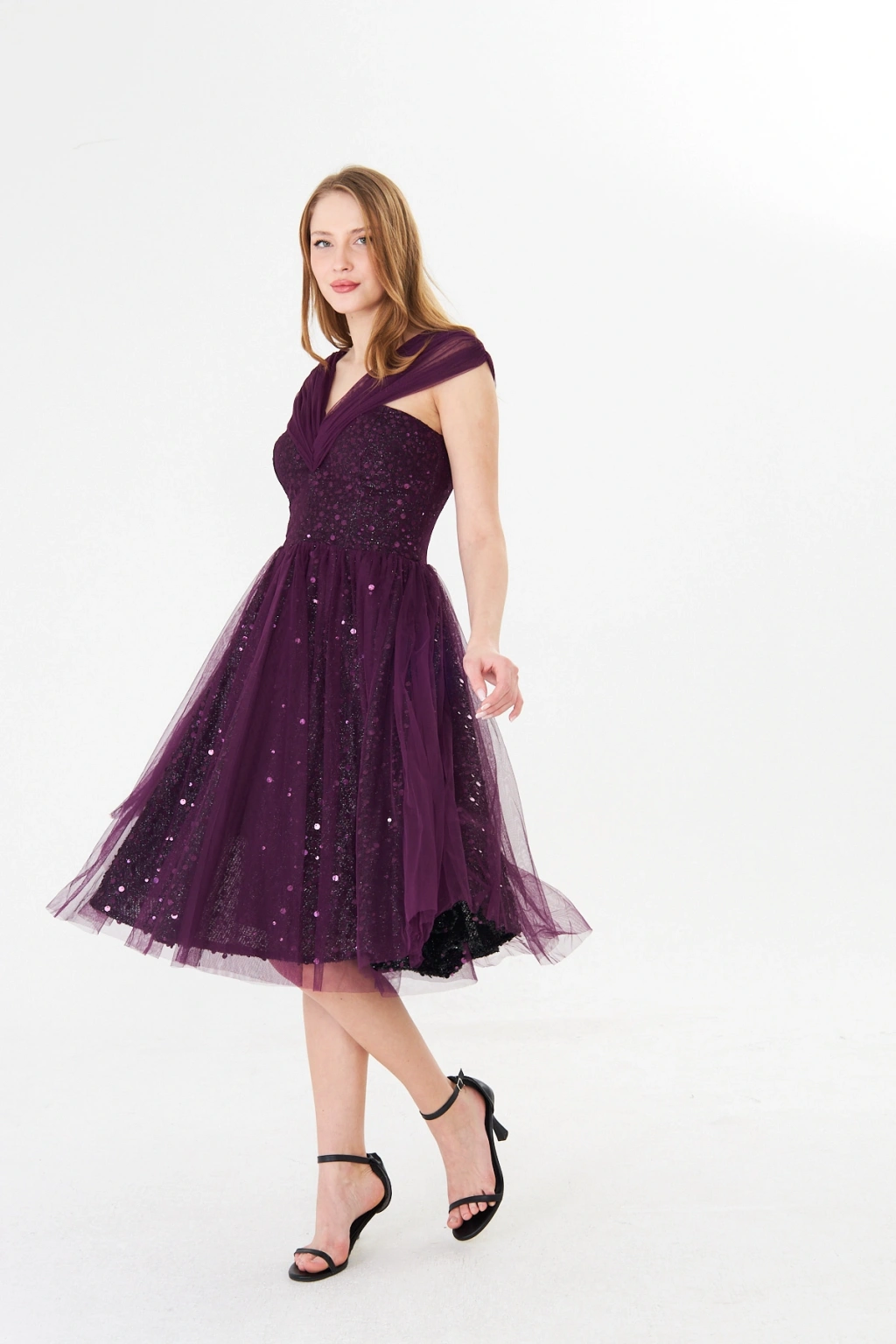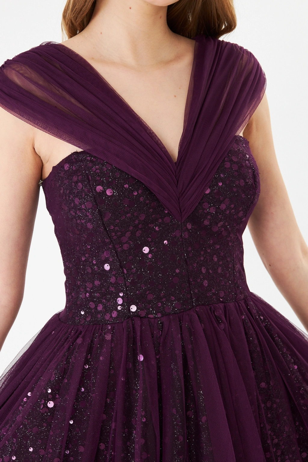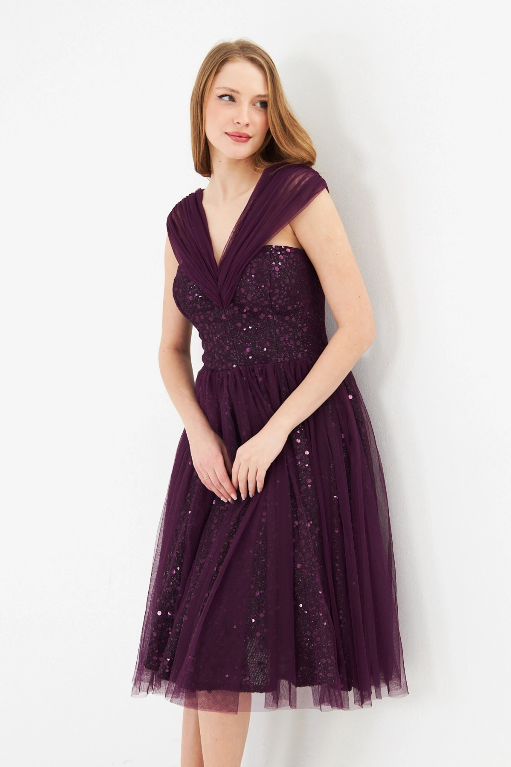 - Zarif kalp yaka tasarımı ile dikkat çeken bu abiye elbise, feminen ve sofistike bir görünüm sunar.; - Mor payet detayları ile ışıltınızı ön plana çıkaran bu elbise, özel gün davetlerinizde göz kamaştırıcı bir stil yaratır.; - Diz altı boyu ve slim silueti ile vücut hatlarınızı zarifçe sararak feminen bir duruş sergiler.; - Kolsuz ve düşük kol tasarımı, omuzlarınızı nazikçe vurgularken rahat hareket etme özgürlüğü sağlar.; - İç göstermeyen astarlı yapısı sayesinde rahatlıkla tercih edebileceğiniz bu elbise, şıklığınızdan ödün vermenize gerek bırakmaz.; - Fermuarlı kapama şekli ile kolayca giyilip çıkartılabilir ve gün boyu konfor sunar.; - Düz deseni ve astarlı dokusu ile sade ama etkileyici bir görünüm elde edersiniz.; - Tüm sezonlarda tercih edebileceğiniz bu midi boy abiye elbise, düğün, nikah gibi özel günlerde vazgeçilmeziniz olacak.;