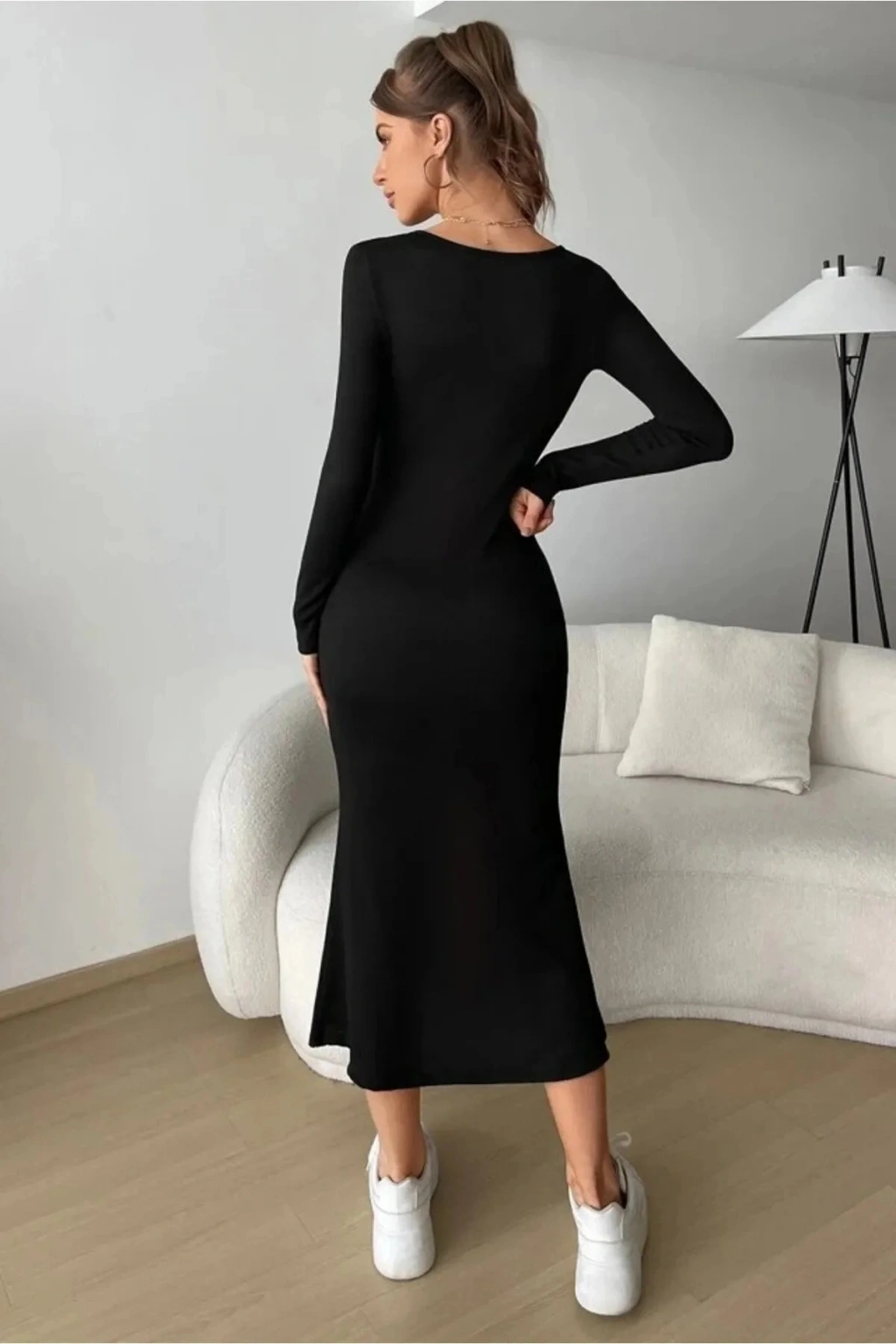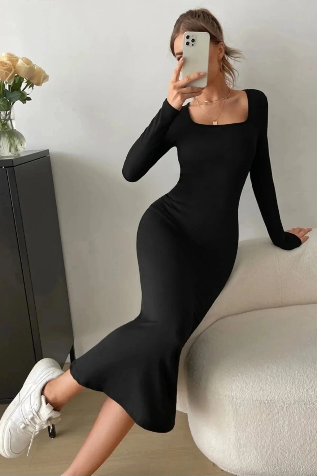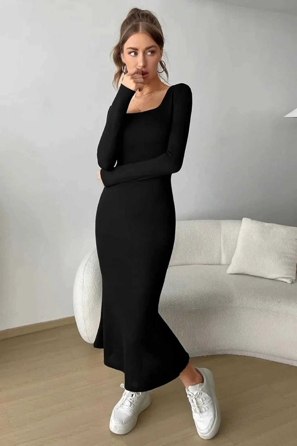 - Vücudu saran kesimi ile feminen bir siluet oluşturur.; - Likralı kumaşı sayesinde hareket özgürlüğü sağlar ve konforlu bir kullanım sunar.; - Uzun kollu tasarımı, mevsim geçişlerinde ideal bir tercih haline getirir.; - Kare yaka detayı ile zarif ve modern bir görünüm kazandırır.; - Kemersiz tasarımı, elbisenin sade ve şık durmasını sağlar.; - Cepsiz yapısı, minimalist tarzı benimseyenler için uygundur.; - Kapamasız yapısı sayesinde kolay giyilip çıkartılabilir ve pratik kullanım sunar.; - Slim kalıbı vücut hatlarını ön plana çıkararak zarif bir duruş sağlar.; - Örgü dokuma tipi, dayanıklılığı artırırken şık bir doku kazandırır.; - Pamuk polyester karışımı materyali nefes alabilir yapıda olup uzun süreli rahatlık sunar.; - Kapsız tasarımıyla hafiflik hissi verirken, biyeli detaylar feminenliği artırır.; - Astarsız olması yaz aylarında serinlik hissi verirken, orta kalınlıkta kumaşı dört mevsim konforlu bir kullanım vaat eder.; - Yıkama talimatlarının belirtilmemiş olması, ürünün bakımı konusunda dikkatli olunmasını gerektirir.; - Uzun boyu ile zarif