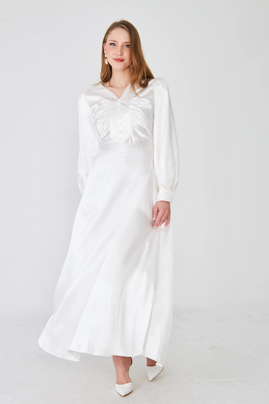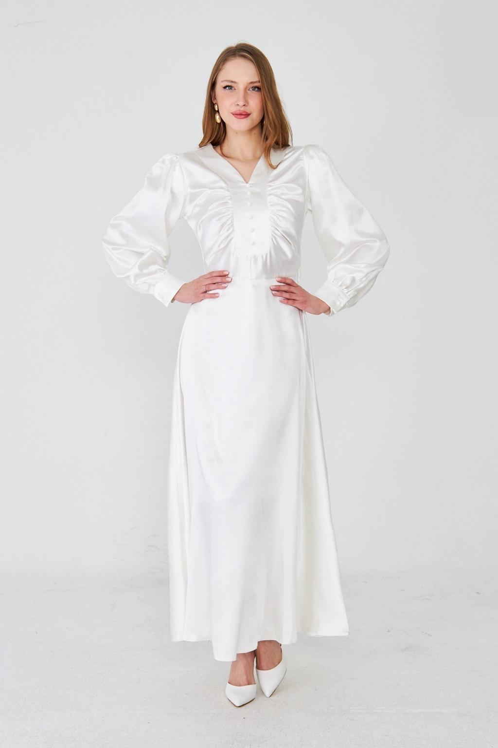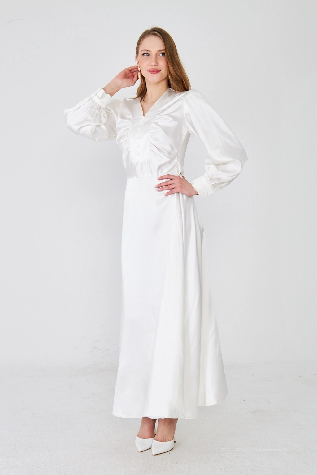 - Zarif saten kumaşı ile göz alıcı bir görünüm sunar.; - Uzun kollu tasarımı ile mevsim geçişlerinde ideal bir seçimdir.; - Düz deseni sayesinde kolayca kombinlenebilir ve şıklığınızı ön plana çıkarır.; - V yaka detayı ile feminen bir siluet oluşturur.; - Düğme detayları, hem şık hem de pratik bir kullanım sağlar.; - Orta kalınlıkta saten kumaşı, rahatlık ve şıklığı bir arada sunar.; - Astarlı yapısı ile konforlu bir kullanım deneyimi yaşatır.; - Regular kalıp, vücut hatlarını nazikçe sararak rahat bir oturuş sağlar.; - Düğme ve fermuar kapama şekliyle kolay giyilip çıkarılabilir.; - Maxi boyu ile modern ve trend bir görünüm kazandırır.; - Tüm sezonlar için uygun olan bu elbise, gardırobunuzun vazgeçilmezi olacak.;