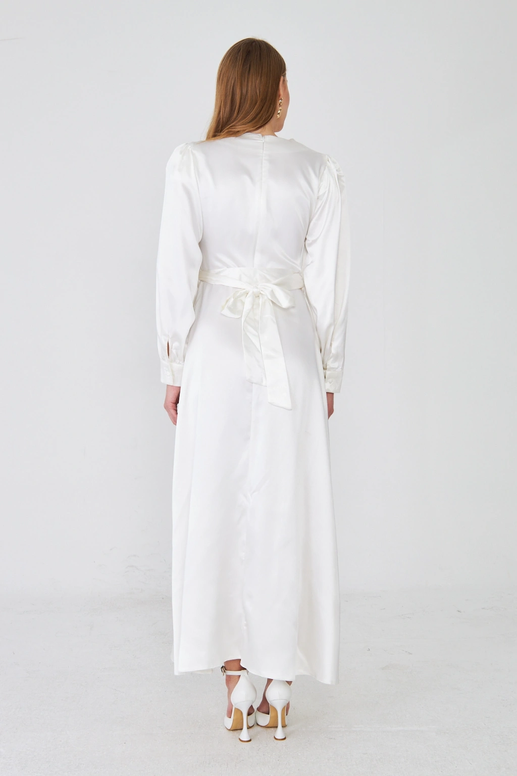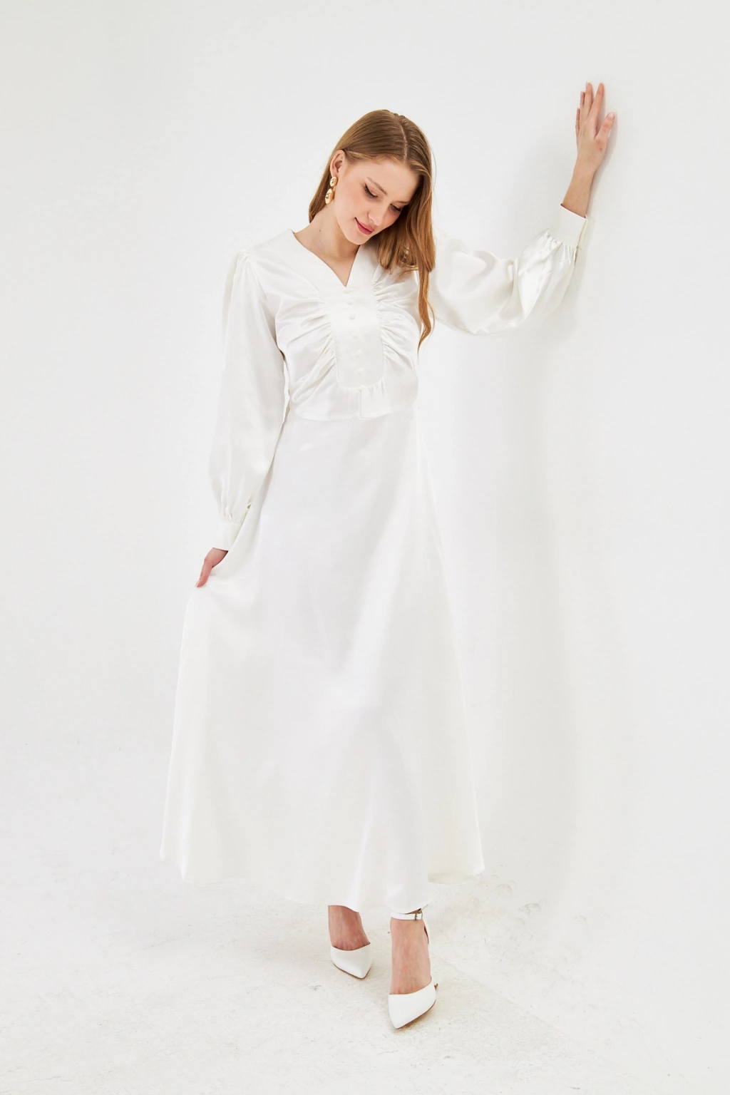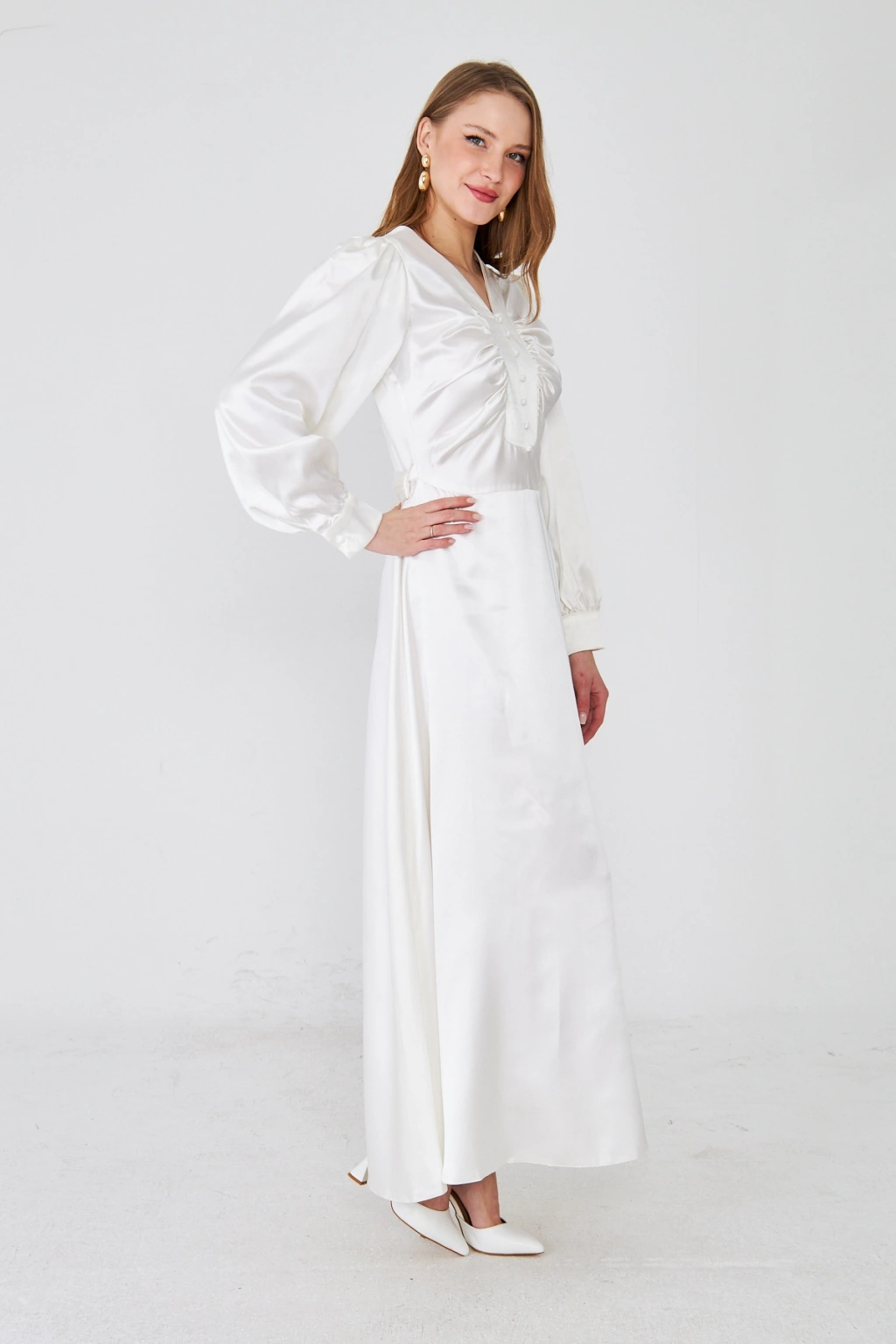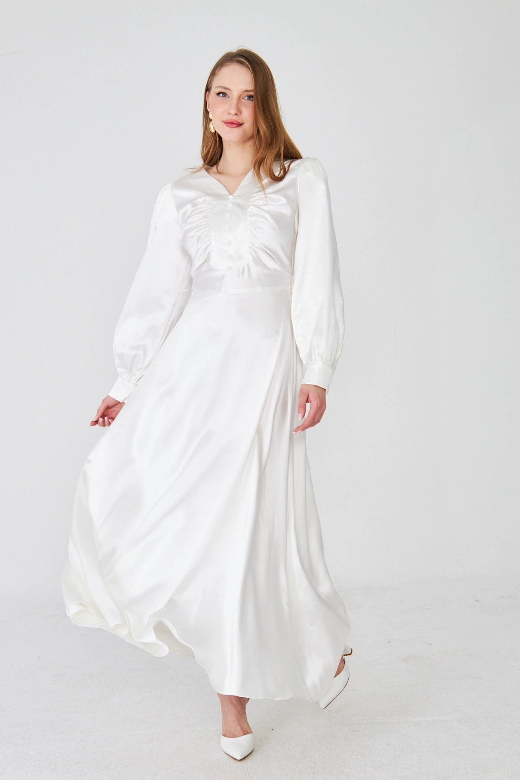 - Zarif saten kumaşı ile göz alıcı bir görünüm sunar.; - Uzun kollu tasarımı ile mevsim geçişlerinde ideal bir seçimdir.; - Düz deseni sayesinde kolayca kombinlenebilir ve şıklığınızı ön plana çıkarır.; - V yaka detayı ile feminen bir siluet oluşturur.; - Düğme detayları, hem şık hem de pratik bir kullanım sağlar.; - Orta kalınlıkta saten kumaşı, rahatlık ve şıklığı bir arada sunar.; - Astarlı yapısı ile konforlu bir kullanım deneyimi yaşatır.; - Regular kalıp, vücut hatlarını nazikçe sararak rahat bir oturuş sağlar.; - Düğme ve fermuar kapama şekliyle kolay giyilip çıkarılabilir.; - Maxi boyu ile modern ve trend bir görünüm kazandırır.; - Tüm sezonlar için uygun olan bu elbise, gardırobunuzun vazgeçilmezi olacak.;