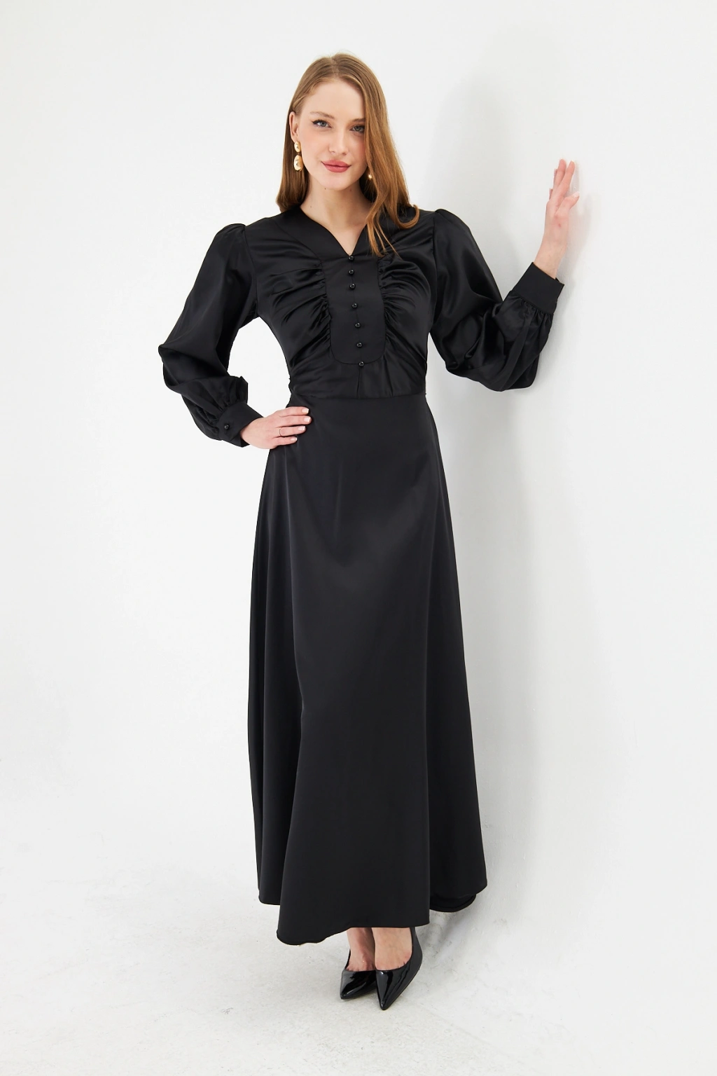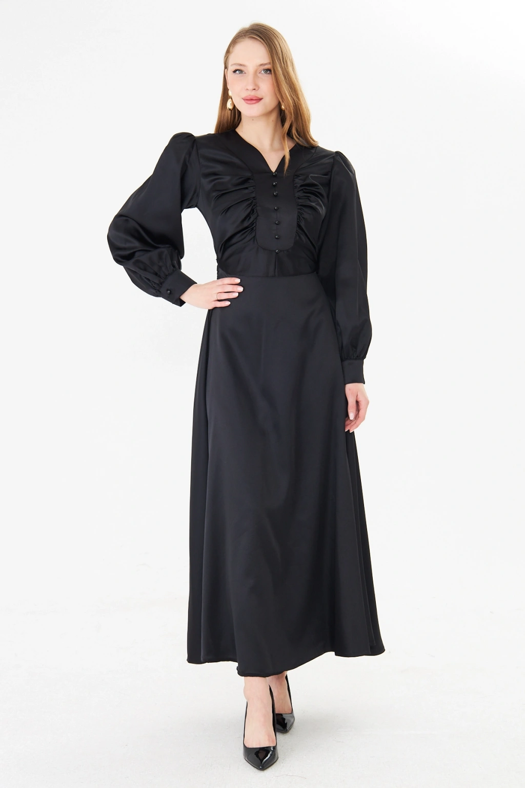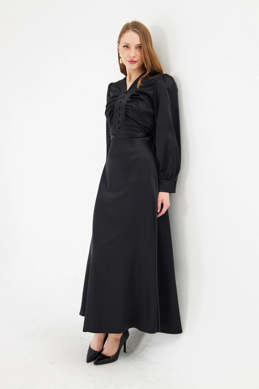 - Zarif saten kumaşı ile göz alıcı bir görünüm sunar.; - Uzun kollu tasarımı ile mevsim geçişlerinde ideal bir seçimdir.; - Düz deseni sayesinde kolayca kombinlenebilir ve şıklığınızı ön plana çıkarır.; - V yaka detayı ile feminen bir siluet oluşturur.; - Düğme detayları, hem şık hem de pratik bir kullanım sağlar.; - Orta kalınlıkta saten kumaşı, rahatlık ve şıklığı bir arada sunar.; - Astarlı yapısı ile konforlu bir kullanım deneyimi yaşatır.; - Regular kalıp, vücut hatlarını nazikçe sararak rahat bir oturuş sağlar.; - Düğme ve fermuar kapama şekliyle kolay giyilip çıkarılabilir.; - Maxi boyu ile modern ve trend bir görünüm kazandırır.; - Tüm sezonlar için uygun olan bu elbise, gardırobunuzun vazgeçilmezi olacak.;