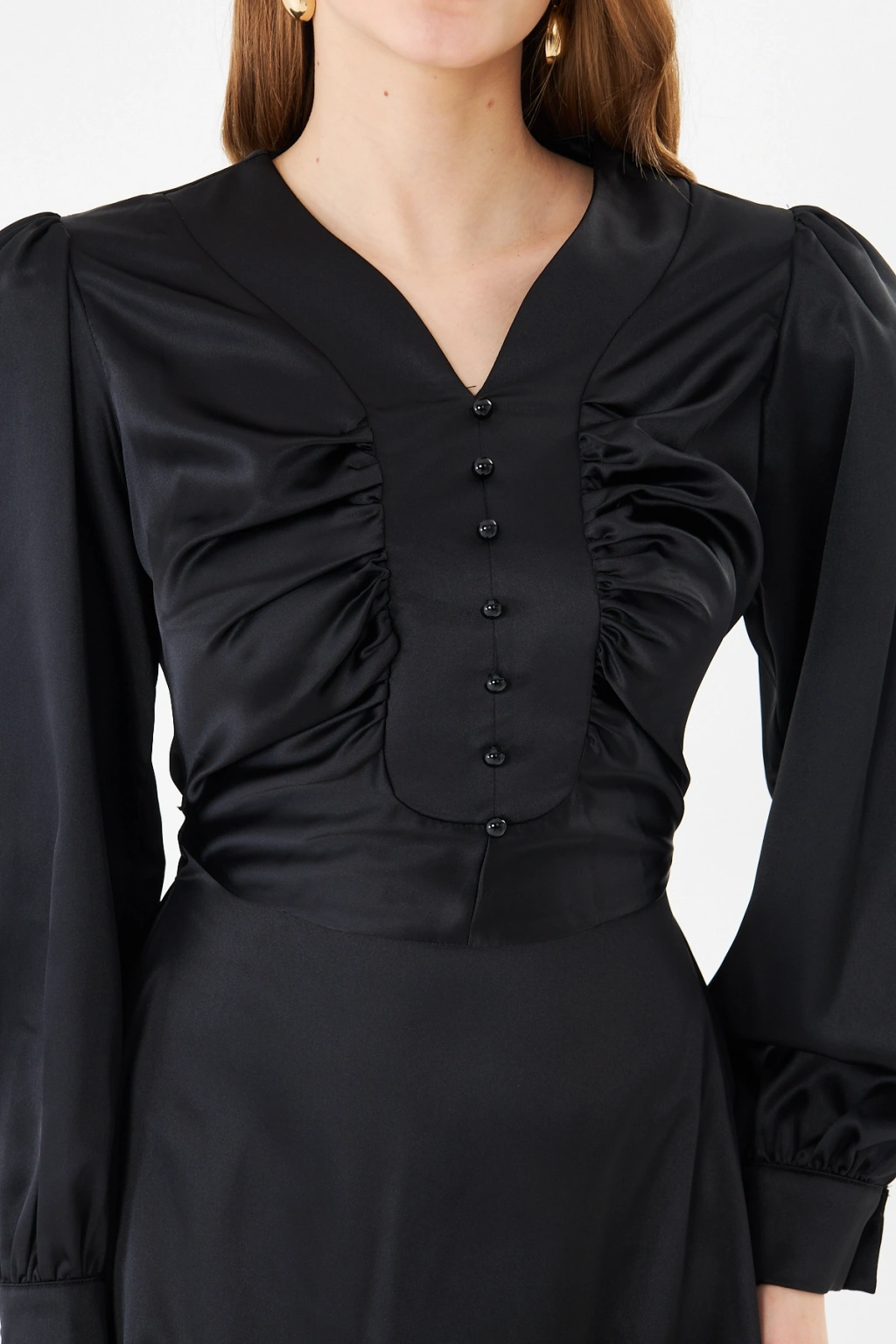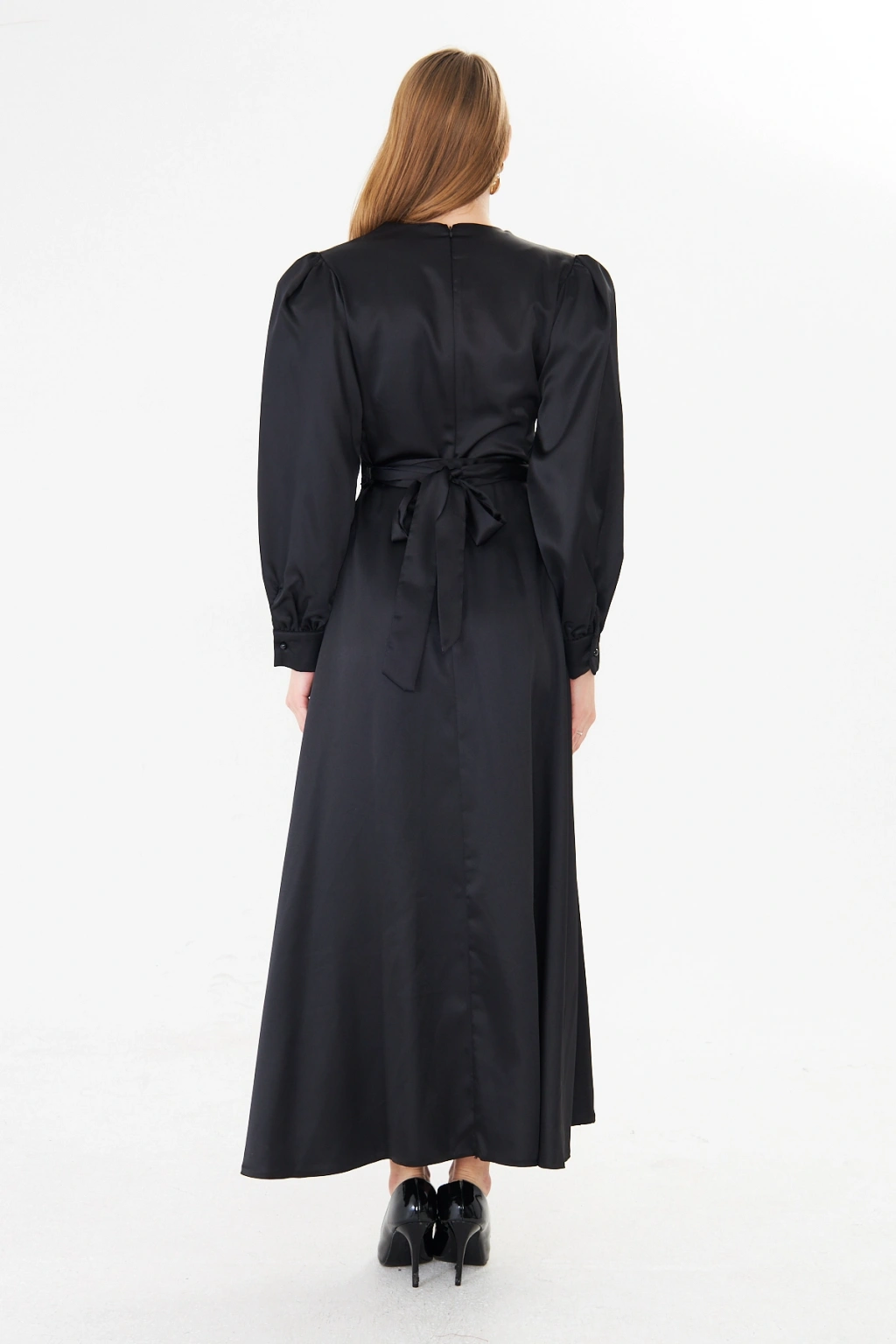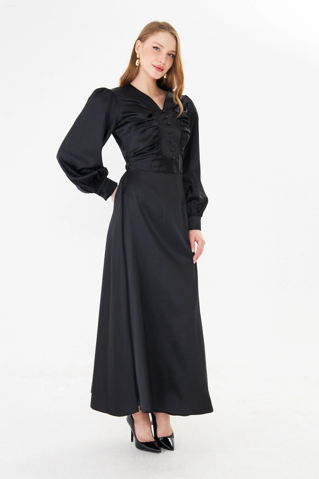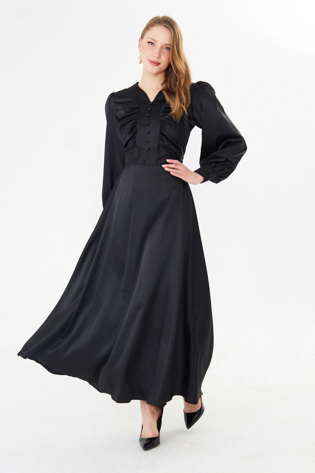 - Zarif saten kumaşı ile göz alıcı bir görünüm sunar.; - Uzun kollu tasarımı ile mevsim geçişlerinde ideal bir seçimdir.; - Düz deseni sayesinde kolayca kombinlenebilir ve şıklığınızı ön plana çıkarır.; - V yaka detayı ile feminen bir siluet oluşturur.; - Düğme detayları, hem şık hem de pratik bir kullanım sağlar.; - Orta kalınlıkta saten kumaşı, rahatlık ve şıklığı bir arada sunar.; - Astarlı yapısı ile konforlu bir kullanım deneyimi yaşatır.; - Regular kalıp, vücut hatlarını nazikçe sararak rahat bir oturuş sağlar.; - Düğme ve fermuar kapama şekliyle kolay giyilip çıkarılabilir.; - Maxi boyu ile modern ve trend bir görünüm kazandırır.; - Tüm sezonlar için uygun olan bu elbise, gardırobunuzun vazgeçilmezi olacak.;