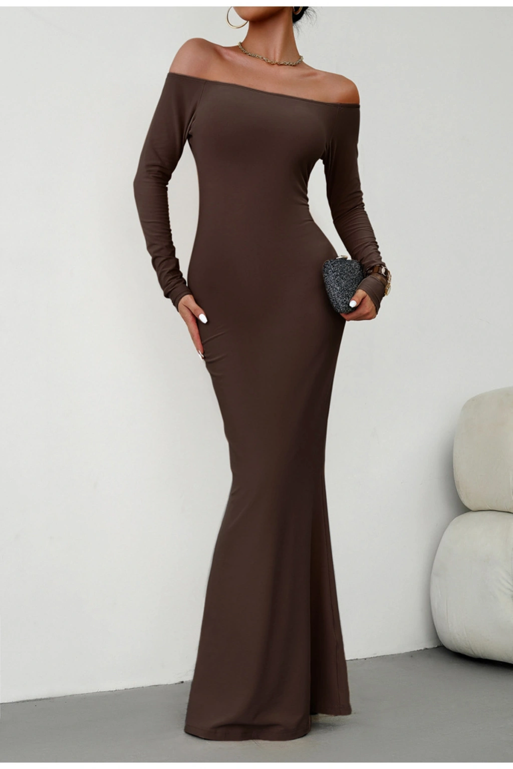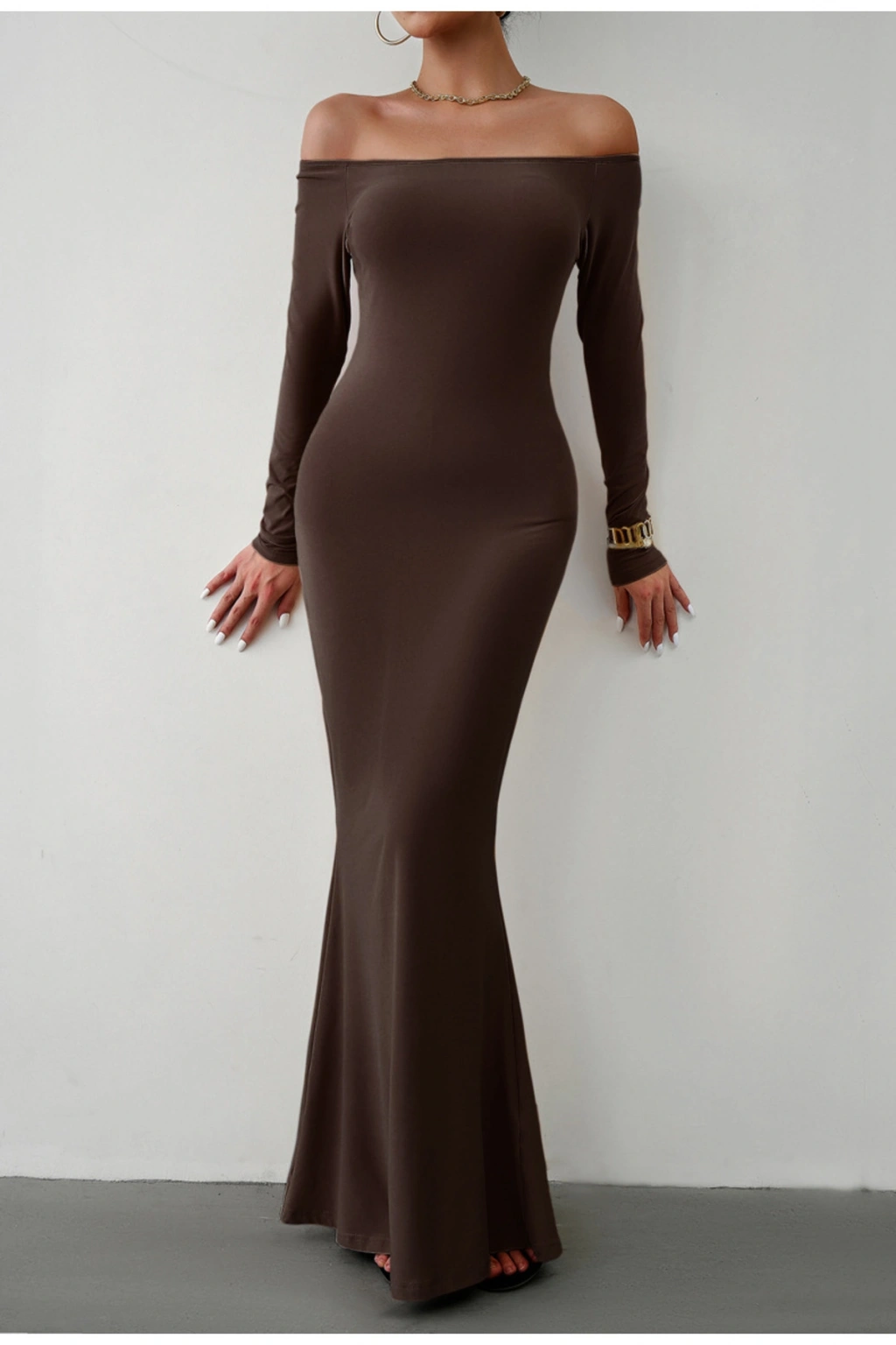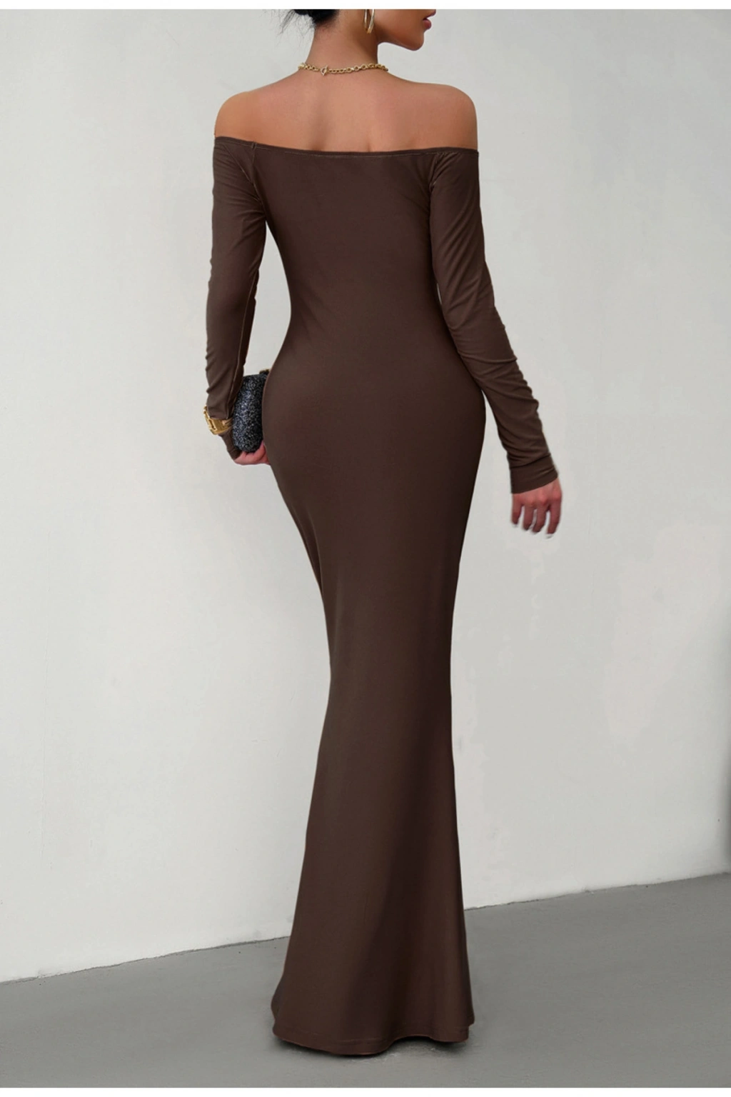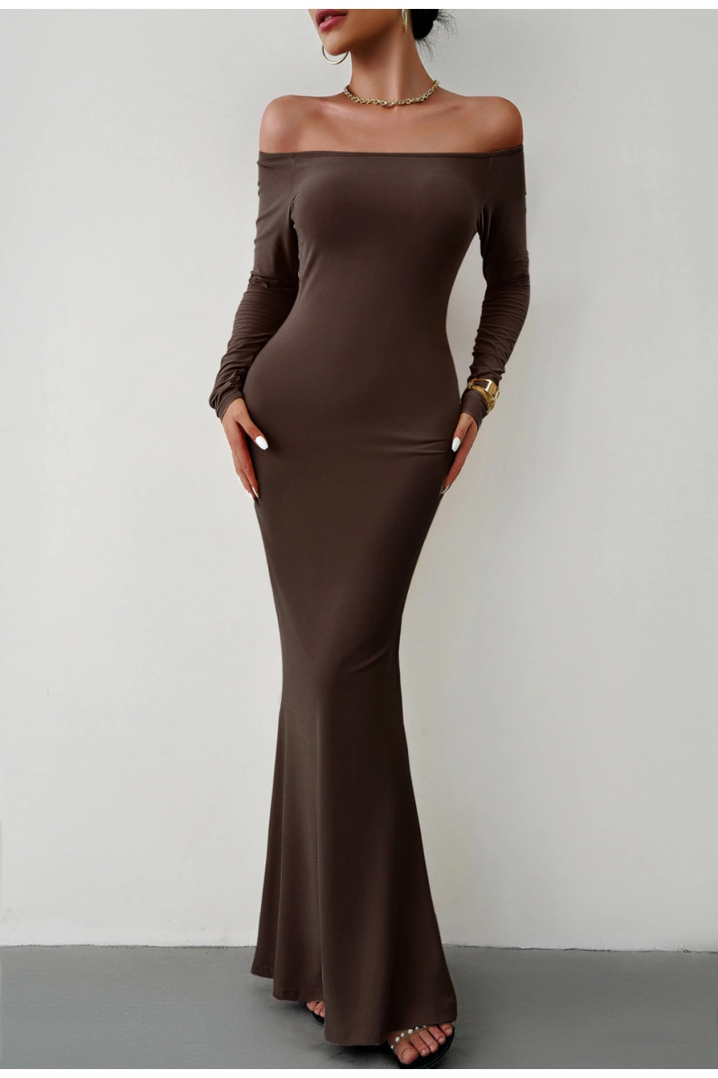 Model: Omuz açık, balık form, vücuda oturan uzun elbise.